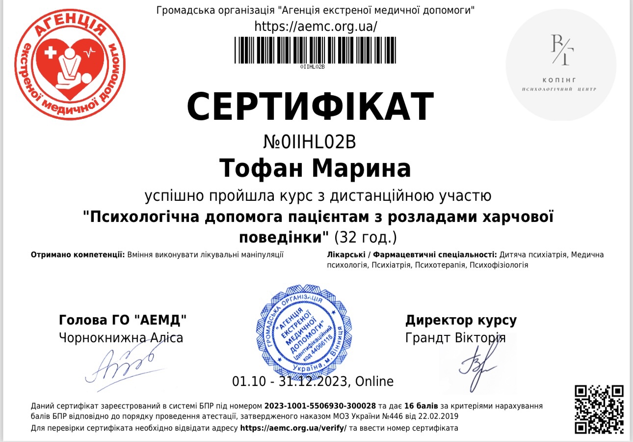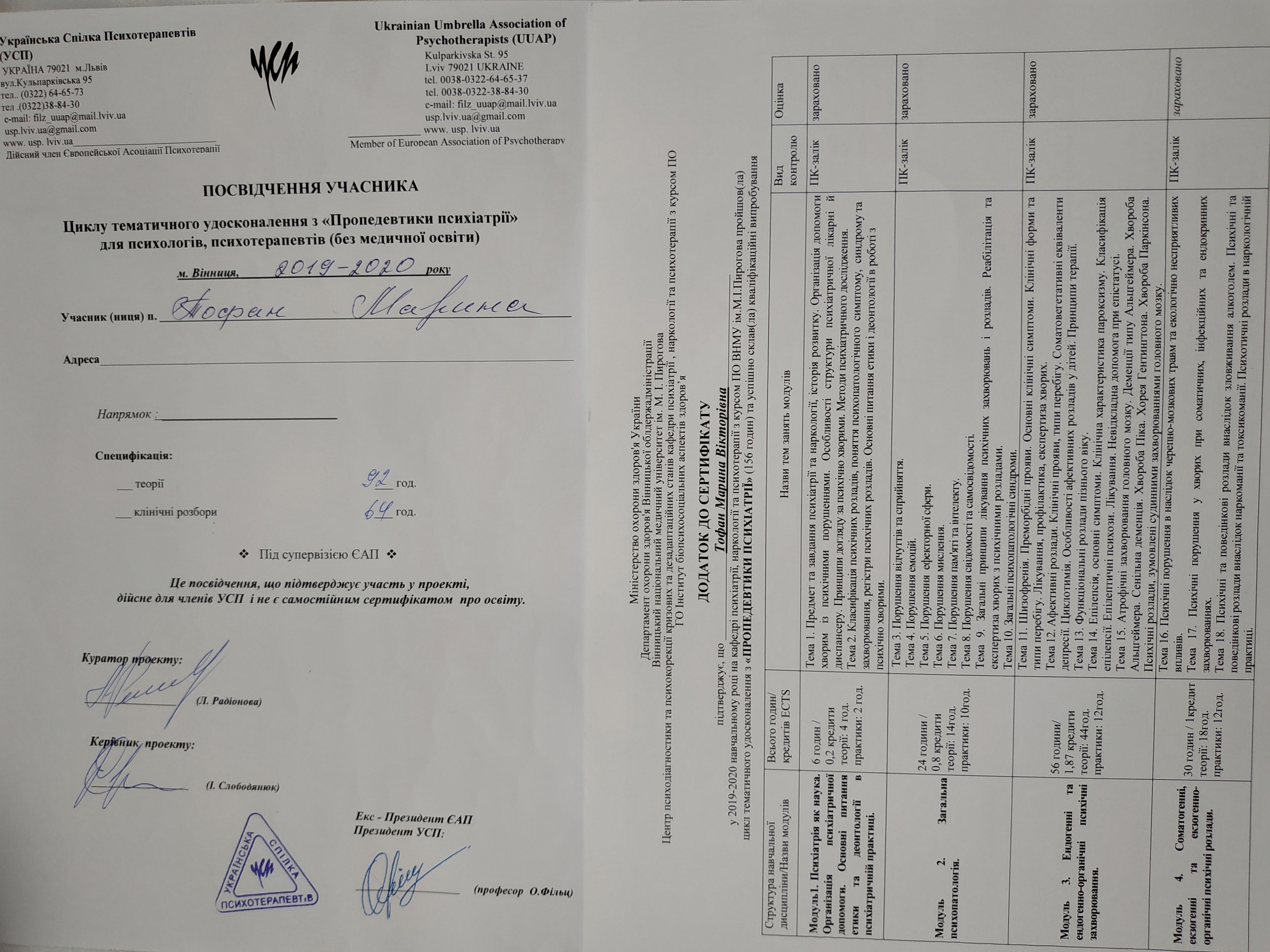 У 2019-2020 навчальному році на кафедрі психіатрії, наркології та психотерапії з курсом ПО ВНМУ ім.М.І.Пирогова пройшов(ла) цикл тематичного удосконалення з «ПРОПЕДЕВТИКИ ПСИХІАТРІЇ» (156 годин) та успішно склав(ла) кваліфікаційні випробування.