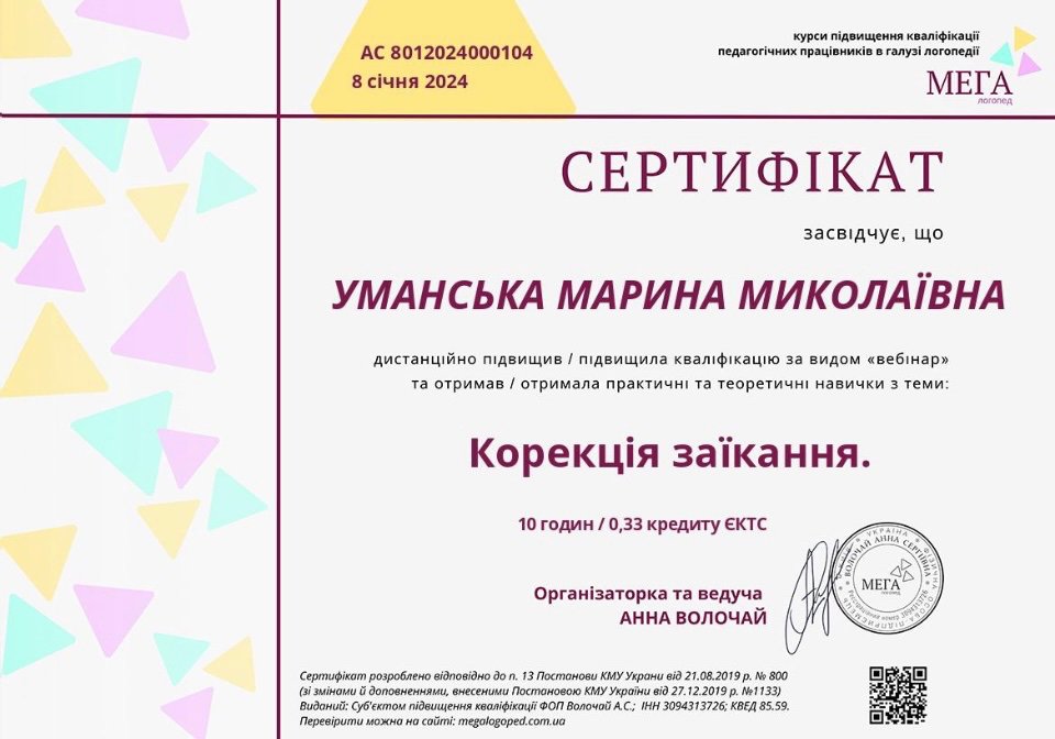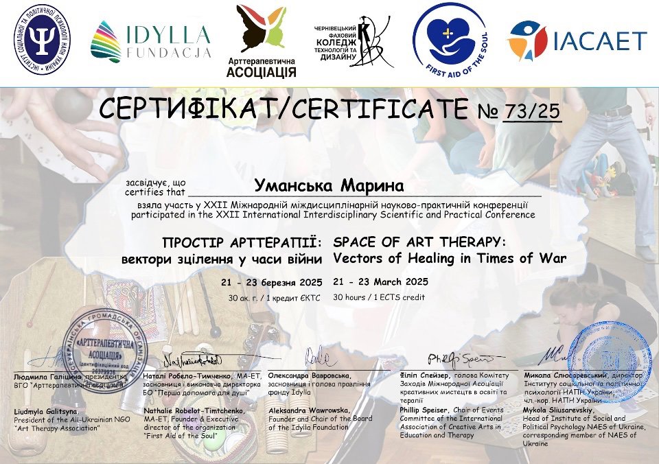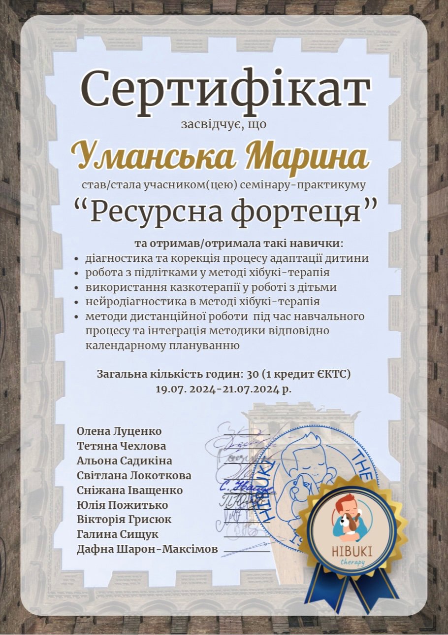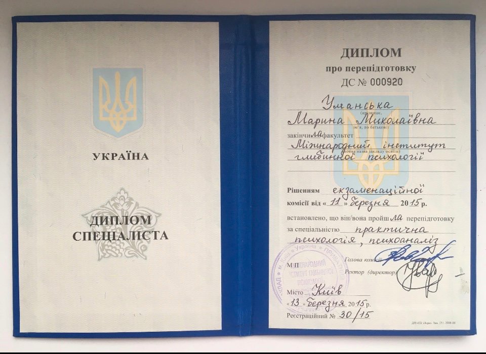 Філологічна та психологічна (Міжнародний інститут глибинної психології), плюс спеціалізація діти та підлітки, дорослі