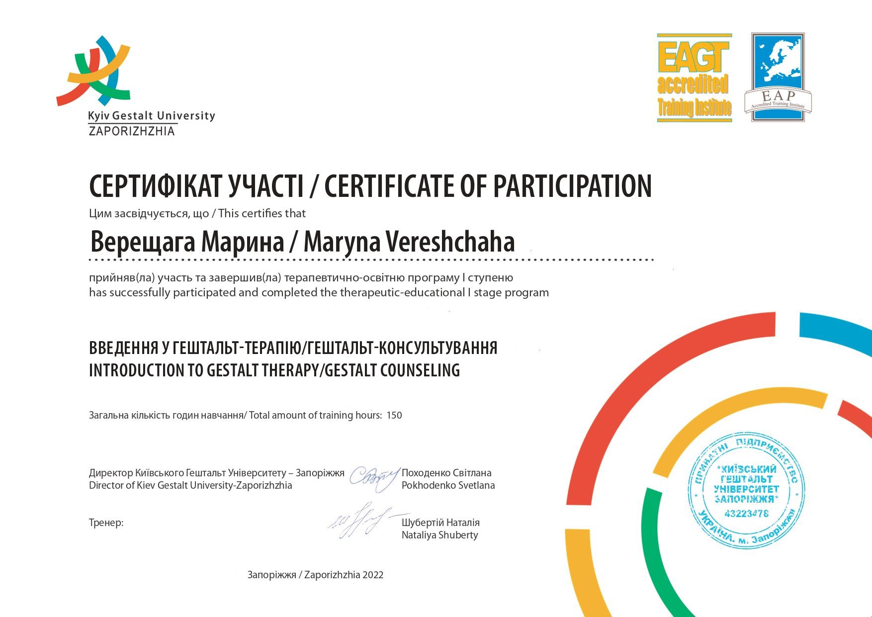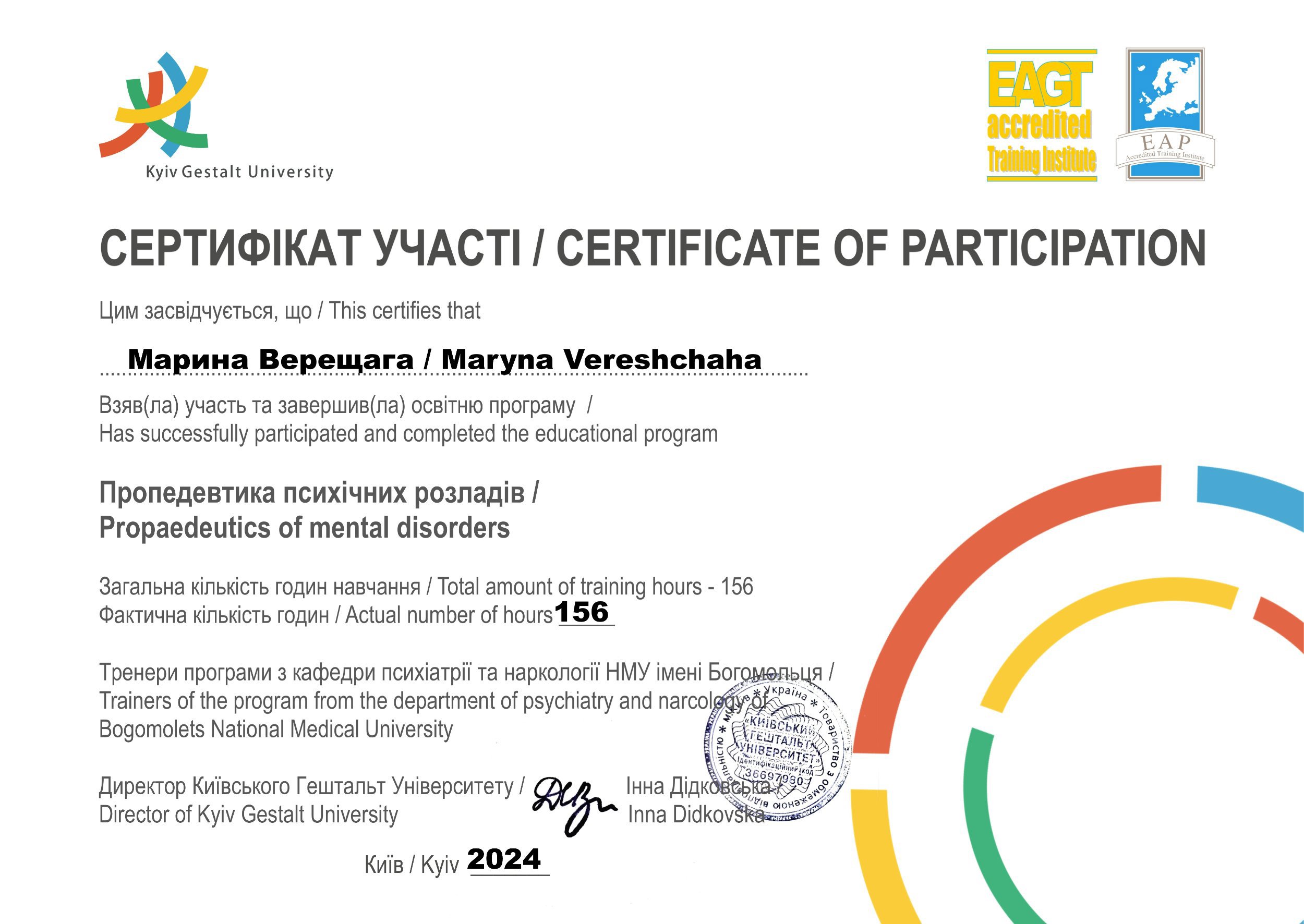 Київський гештальт університет - 1 ступінь гештальт-терапії та консультування.