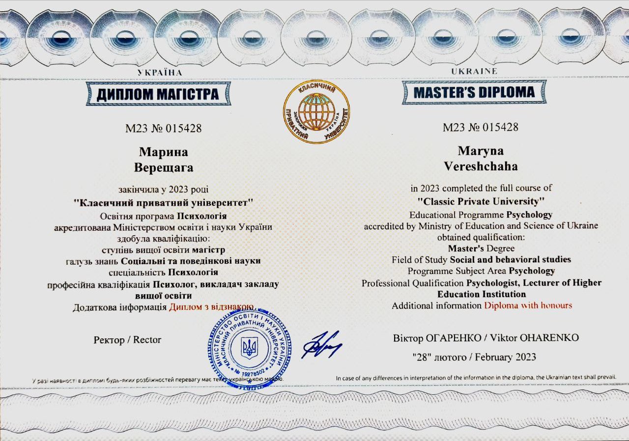 Класичний приватний університет, спеціальність "Психологія", магістр.