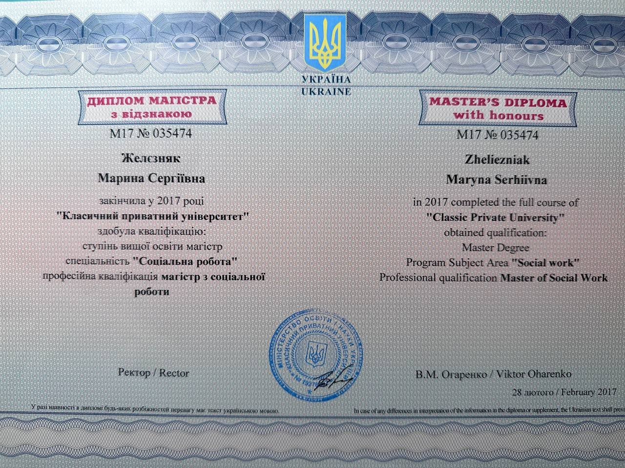 Класичний приватний університет, спеціальність "Соціальна робота", магістр.