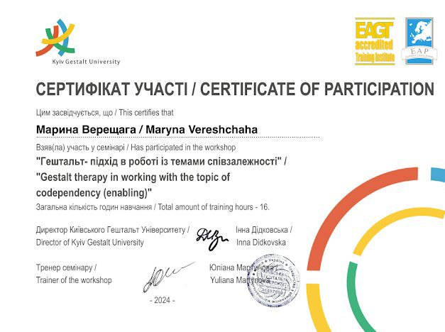 Київський гештальт університет - 2 ступінь гештальт-терапії та консультування(продовжую навчання)