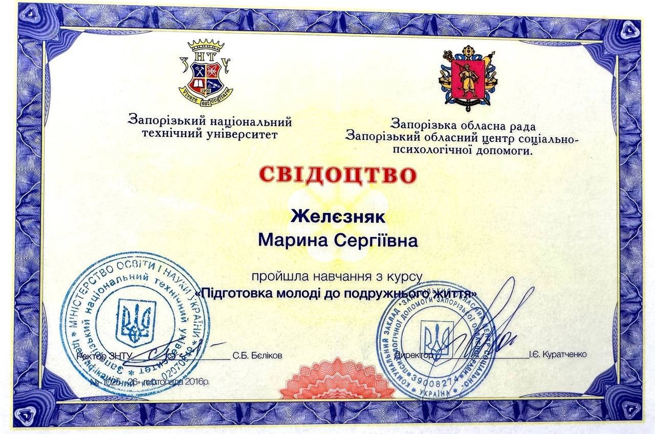 Класичний приватний університет, спеціальність "Психологія", магістр.
