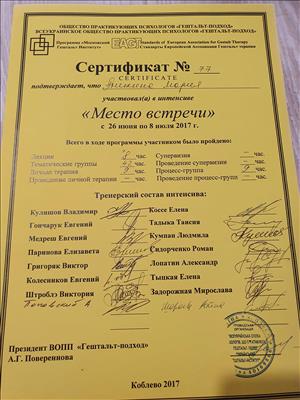 Магістратура з психології в ОНУ ім. І.І. Мечнікова. 2 ступені з підготовки гештальт-терапевтів. Спеціалізація по роботі з психосоматичними розладами у клінічній гештальт-терапії.