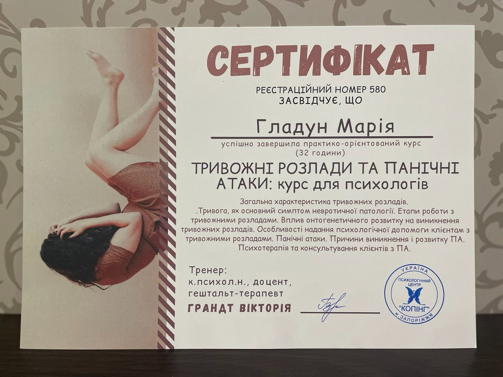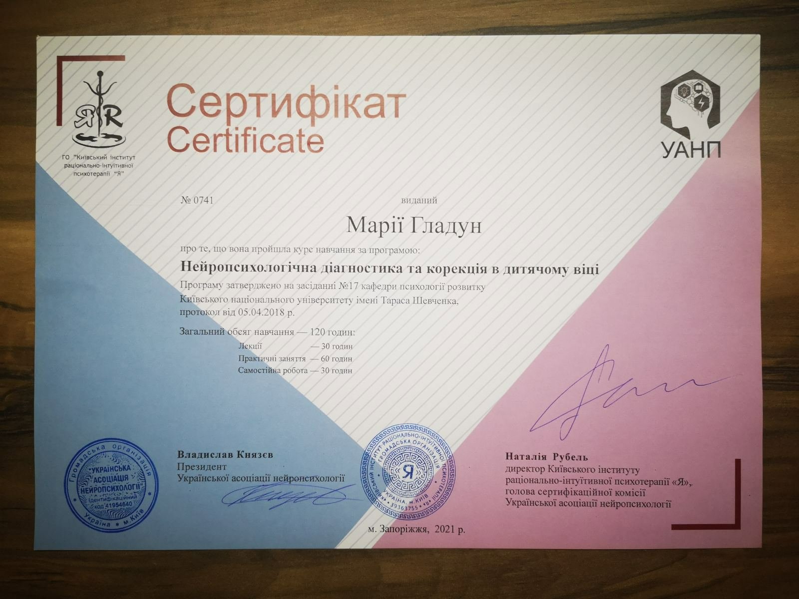 Курс нейропсихологічної діагностики у Київському Інституті Раціонально-Інтуїтивної Терапії.