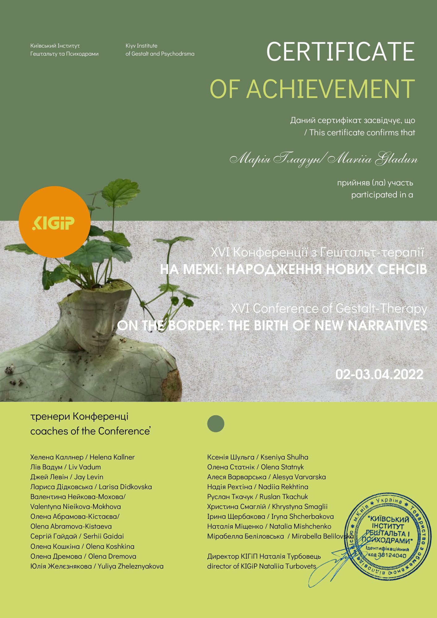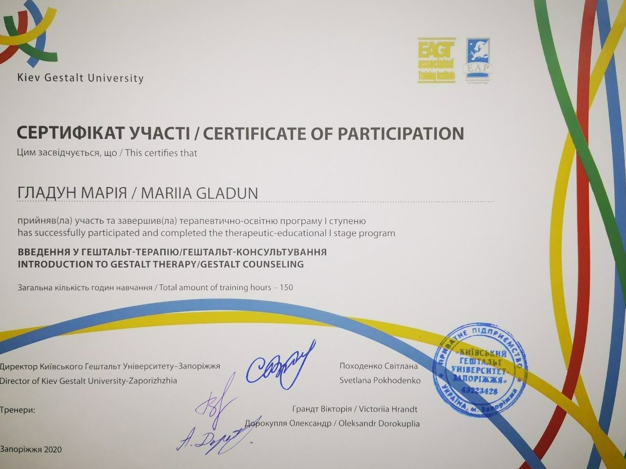 Київський Гештальт Університет (1 щабель).