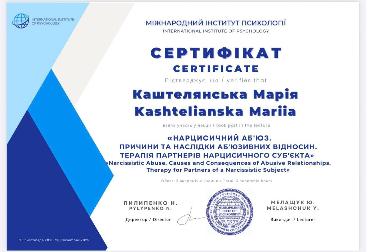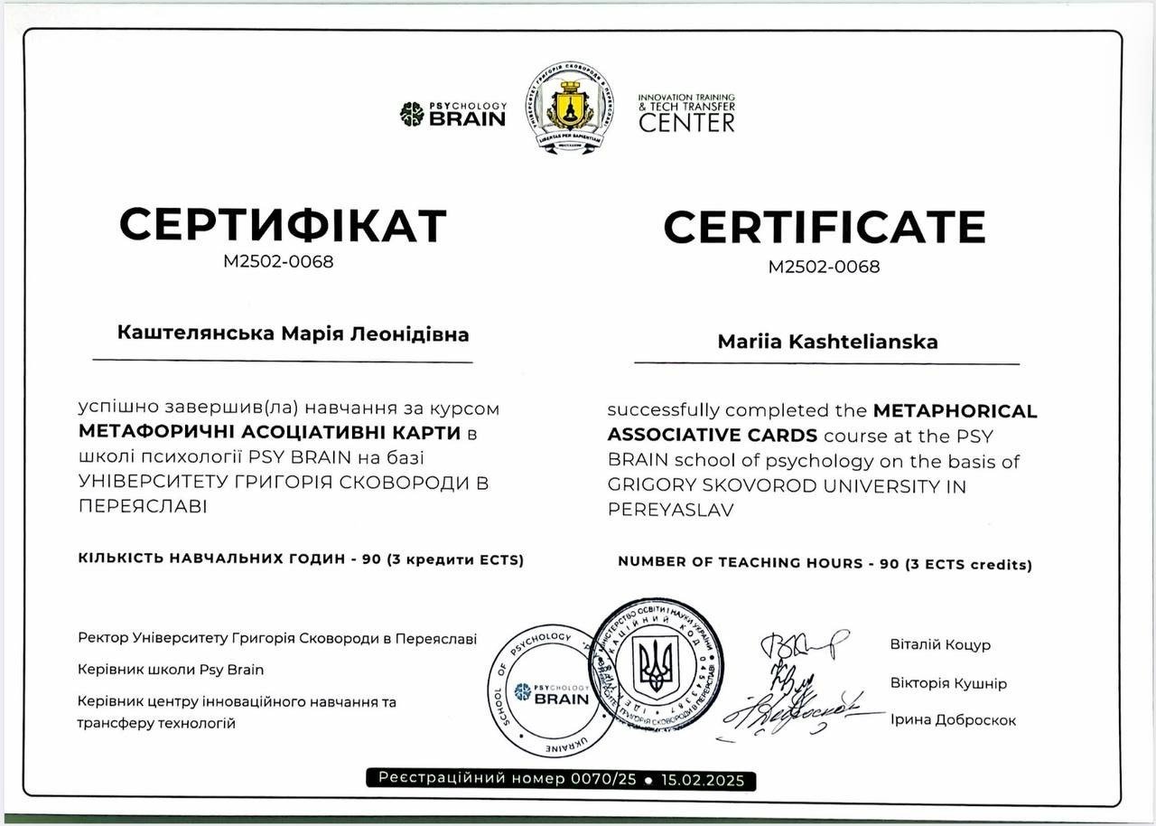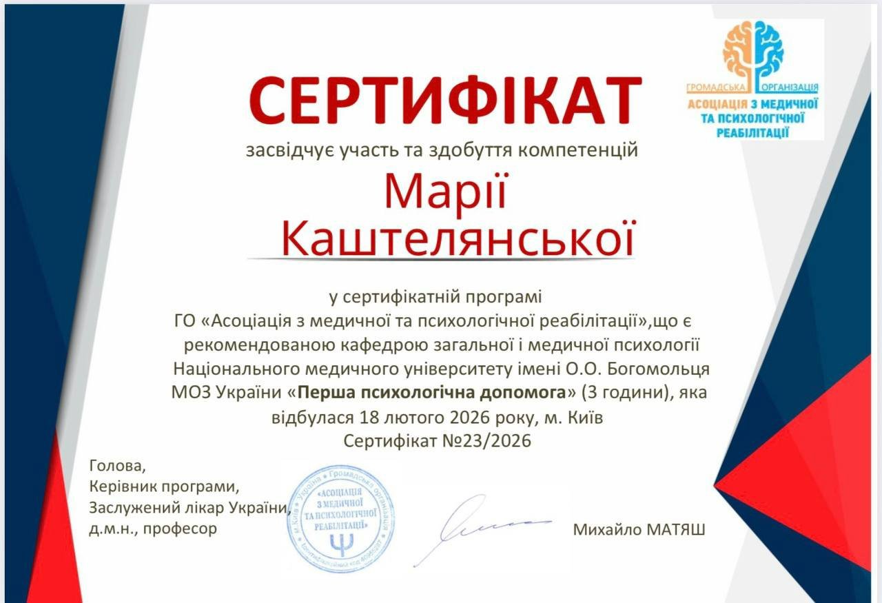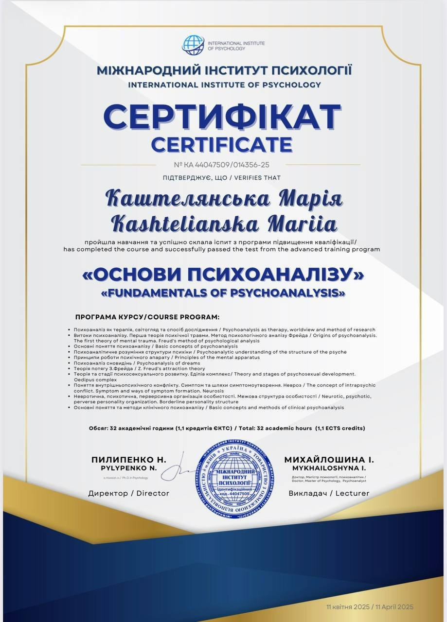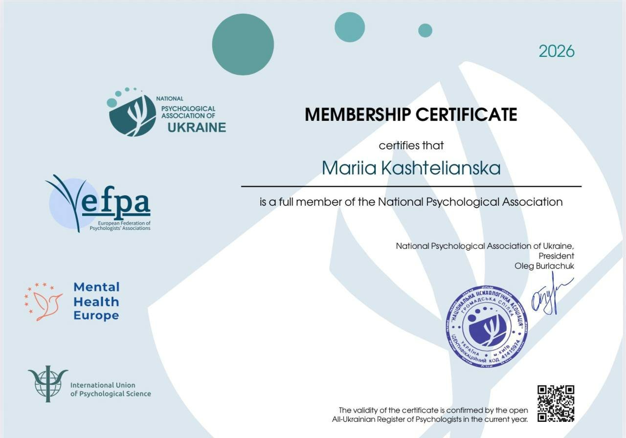Я магістр психології, член Національної психологічної асоціації України.