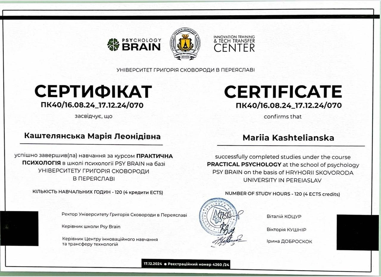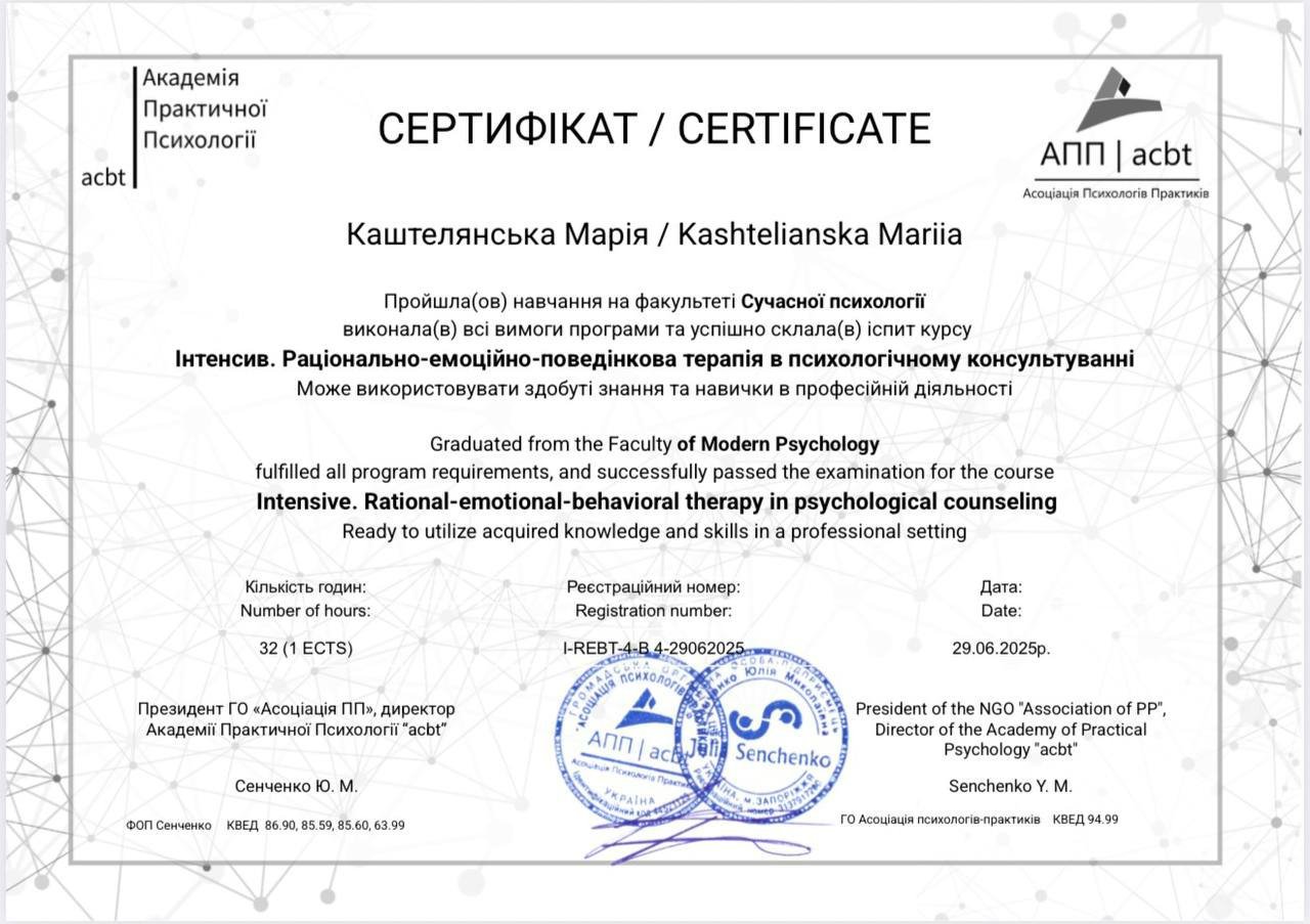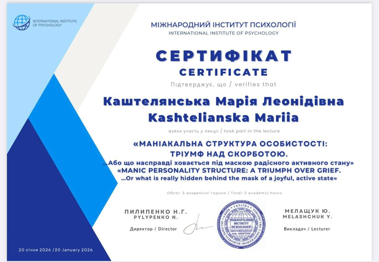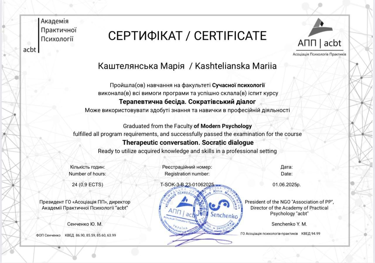 Я магістр психології, член Національної психологічної асоціації України.
