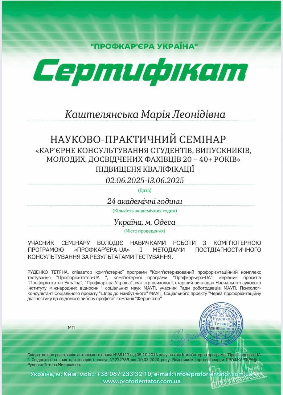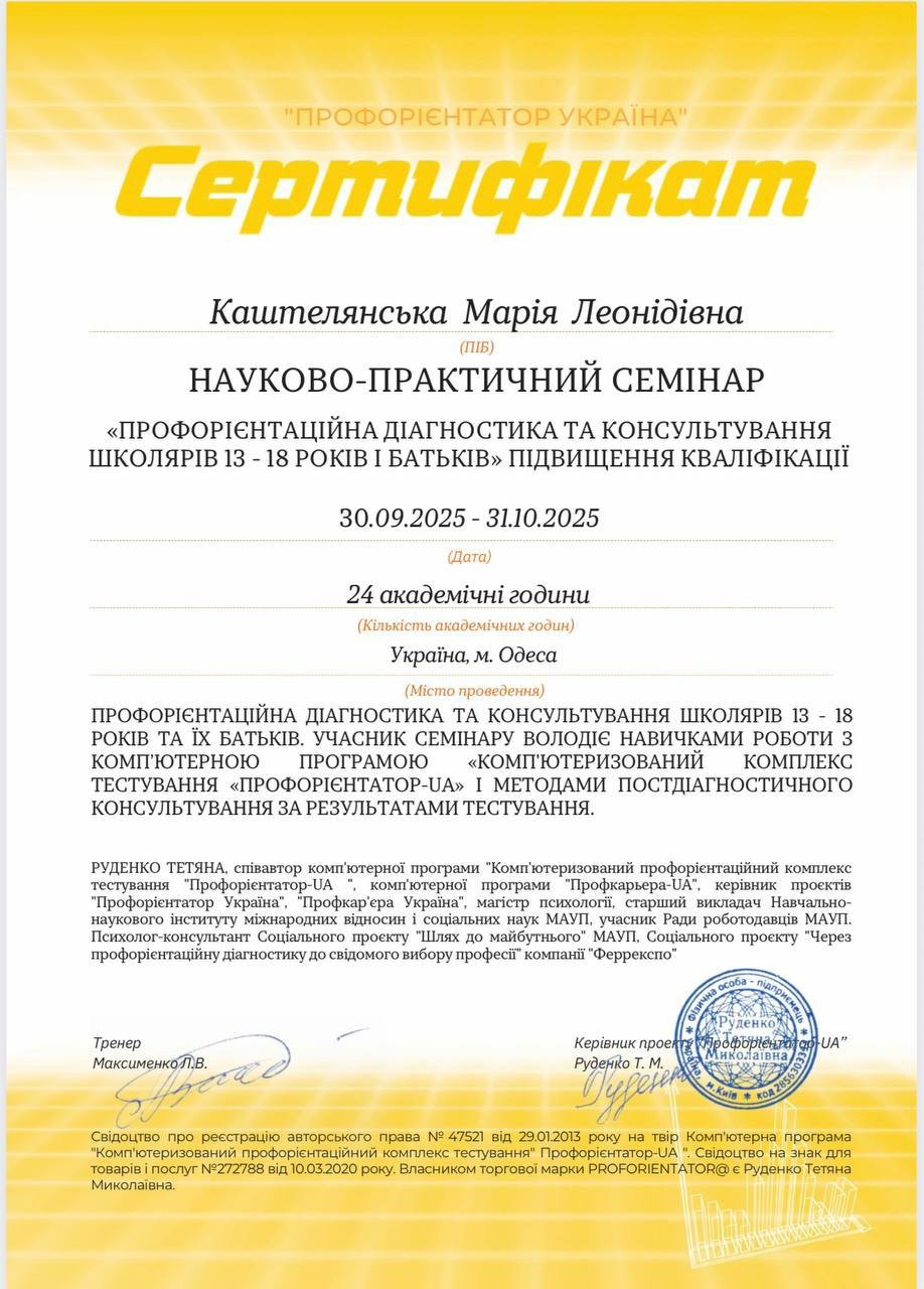 Консультую підлітків та дорослих з питань професійної орієнтації з використанням сертифікованого тесту Профорієнтатор.UA.