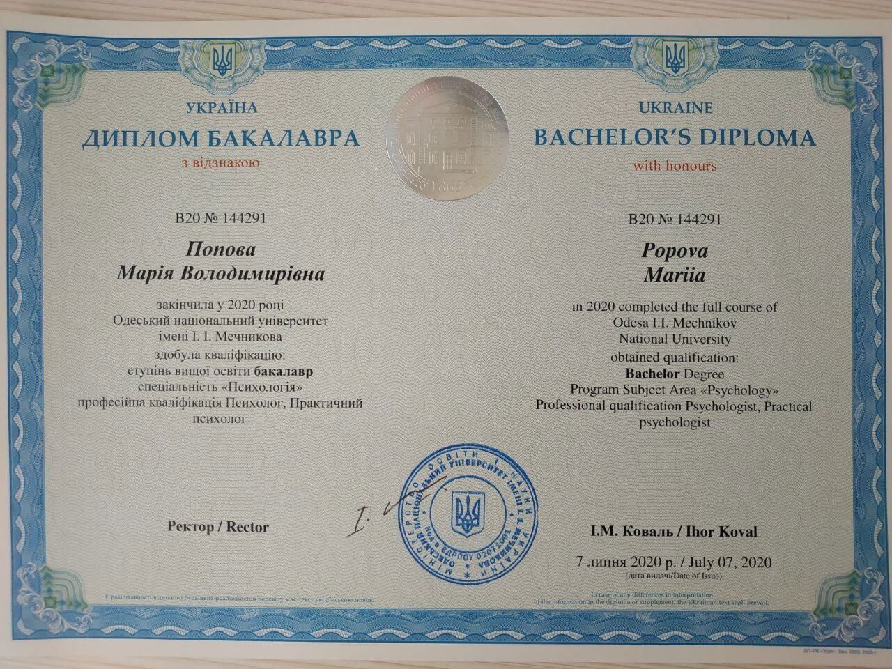 2016-2021 - ОНУ ім. Мечнікова - практичний психолог - бакалавр, магістр