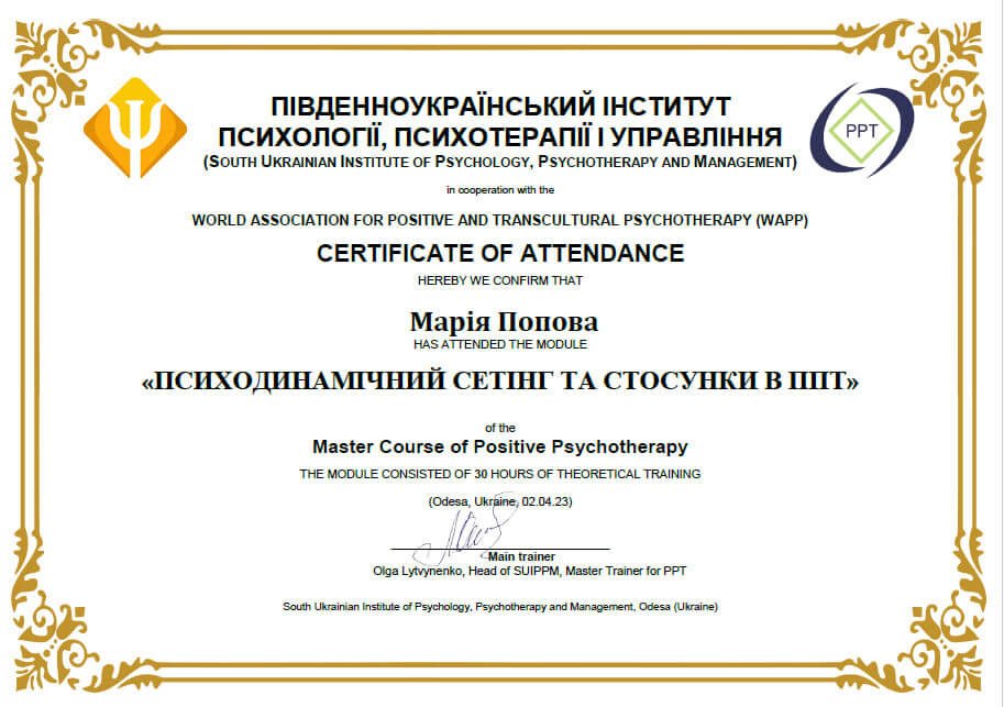 Master Course of Positive Psychotherapy, module «Психодинамічний сетінг та стосунки в ППТ»