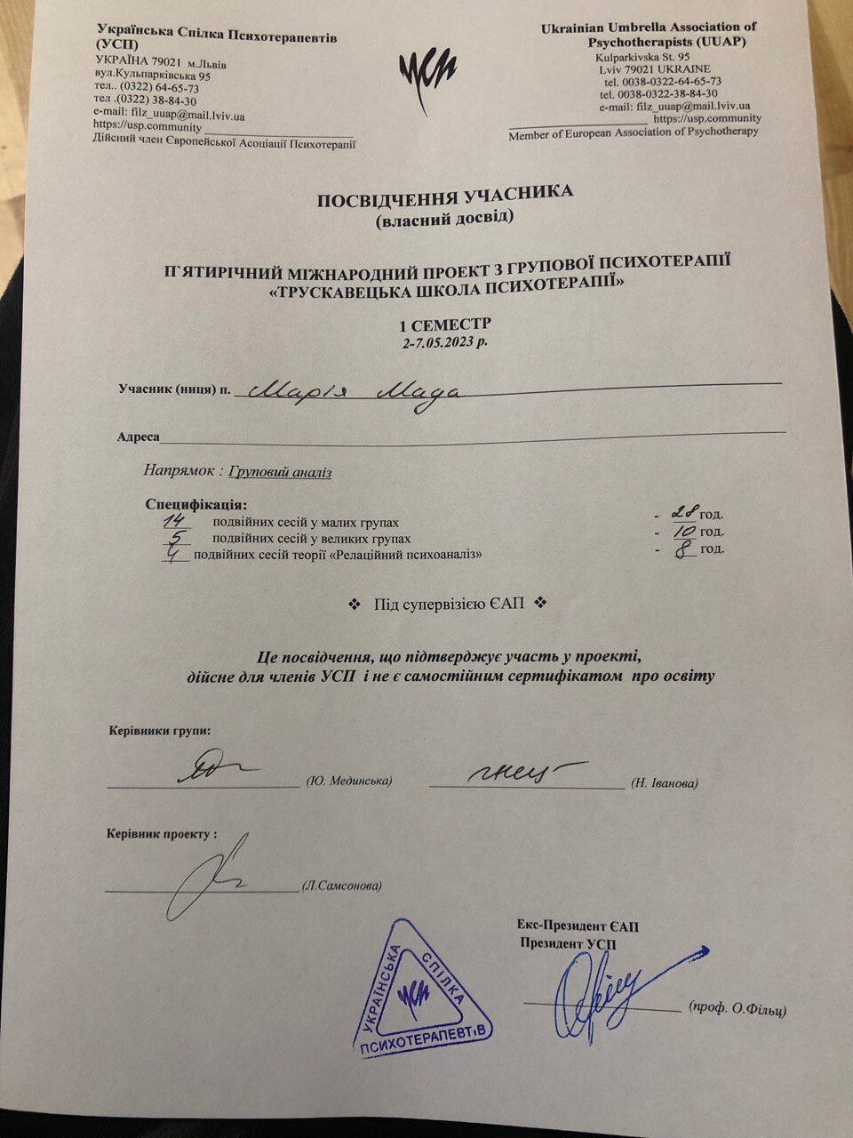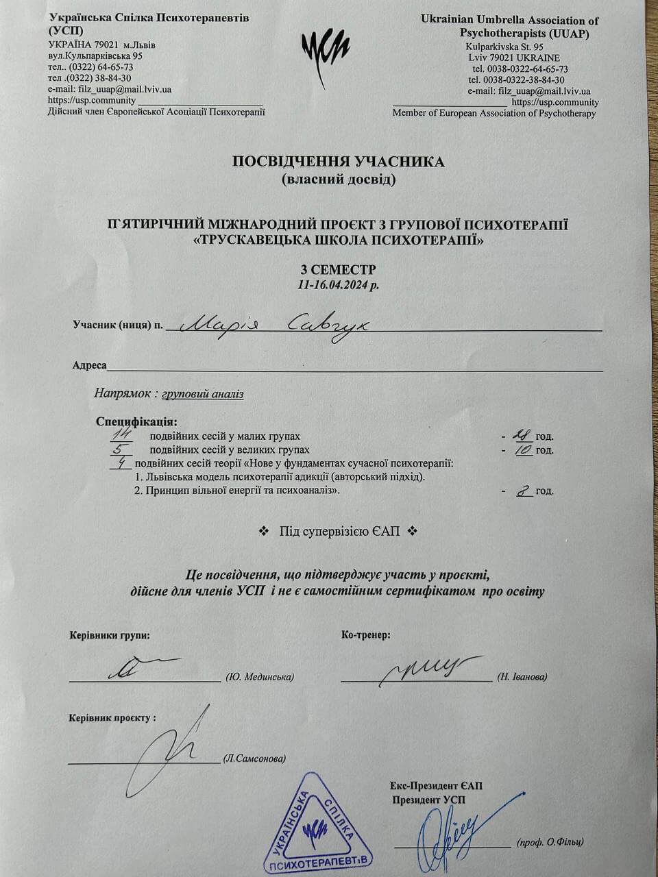 Завершую здобувати психотерапевтичну освіту в напрямку психоаналізу в УПУ (Український психотерапевтичний університет). Навчаюся у Трускавецькому проекті групової психотерапії.