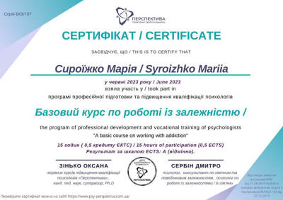 "Базовий курс по роботі із залежністю", психологічний центр "Перспектива" (15 годин)
