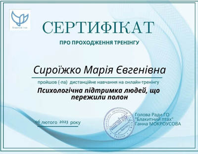 "Психологічна підтримка людей, що пережили полон", ГО "Блакитний птах" (4 години)