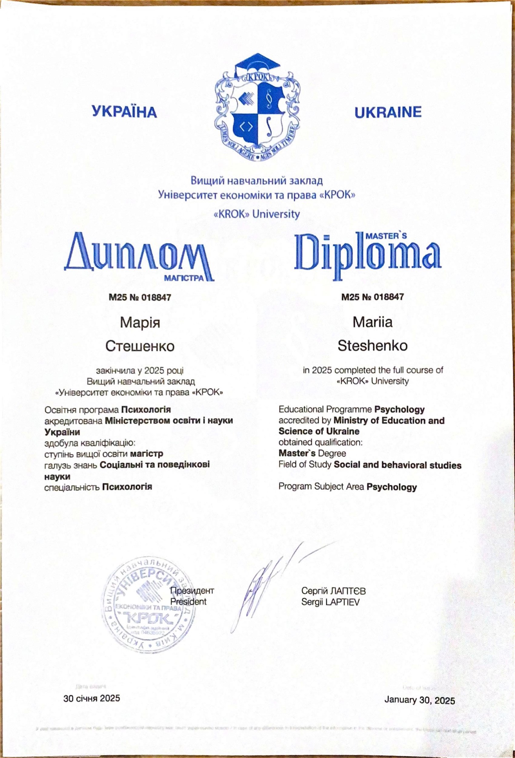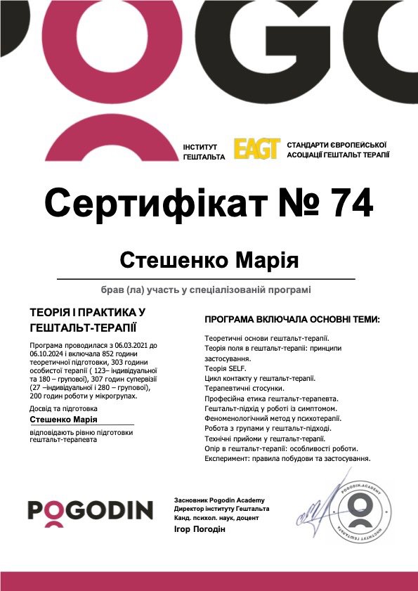 Я — психологиня та гештальт-терапевтка. Для мене терапія — це передусім живий людський контакт, у якому є місце уважності, чесності й повазі до унікального досвіду кожної людини.