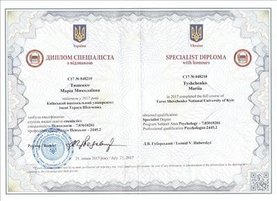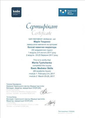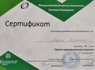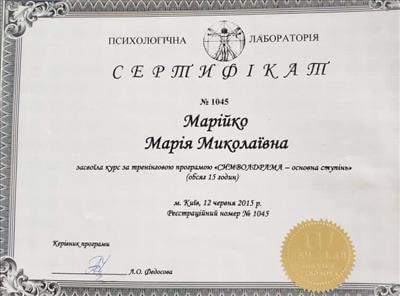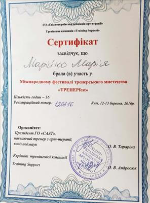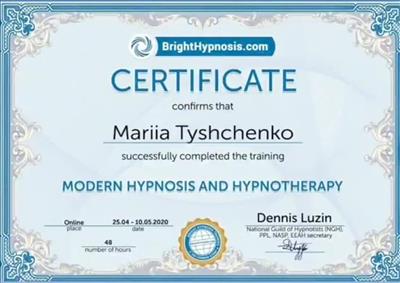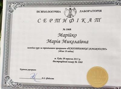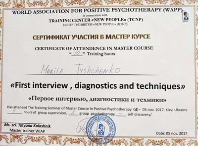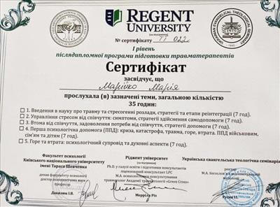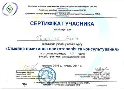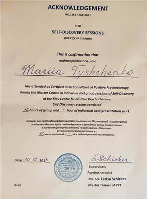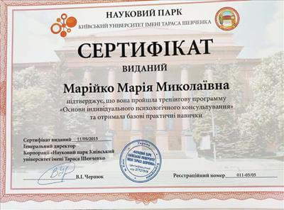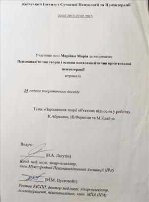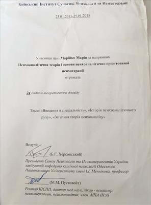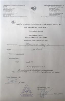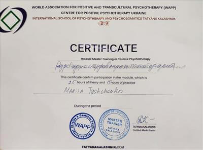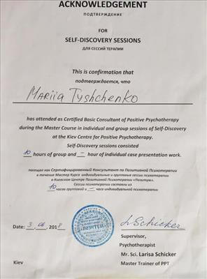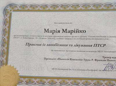 • Systemic Constellations (10 годин). Niels Rosted. 2019.(8 годин) • Positive family therapy, partner counseling. (120 годин). Ukrainian Institute of Positive Psychotherapy. WAPP. 2016 – 2019. • Ресурс-орієнтована психотерапія та консультування. (30 годин). WAPP. 2018 р. • Стресс-менеджмент. (60 годин). WAPP. 2018 р. •Методі терапії емоційних травм: культуральні особливості у консультуванні, кризові інтервенції у групі, групи самодопомоги, групова психотерапія. (30 годин). WAPP. 2018 р. •Застосування ресурс-орієнтованого консультування та позитивної психотерапії у лікуванні, консультуванні, освіті, тренінгах та коучінгу. (30 годин). WAPP. 2018 р. • Динаміка конфлікту, психодинаміка та людський розвиток, салютогенез, здатності до відновлення. (30 годин). WAPP. 2018 р. • Конференція. Медична психологія 12-0. 2018. (18 годин) • Специфічні розлади: ментальні, поведінкові, психосоматичні. (30 годин). WAPP. 2018 р. • Позитивна сімейна терапія, консультування партнерських відносин. (30 годин). Український Інститут Позитивної кросс-культурної психотерапії. 2018 р. • Школи психотерапії та консультування. (30 годин). WAPP. 2018 р. •Третя міжнародна онлайн конференція з Позитивної та транскультуральної психотерапії. 2018. (32 години). • Терапевтичний коучинг (20 годин). Міжнародний центр психології Наталії Холоденко. 2017 р. • Передові концепції позитивної та транскультурної психотерапії та консультування (30 годин). WAPP. 2017 р. • НЛП практик (60 годин). Пьюселік Консалтинг Груп. 2017 р. • Терапевтичні відносини. фактори ефективності у психотерапії та консультуванні (30 годин). WAPP. 2017 р. • Консультант у методі позитивної психотерапії (120 годин). WAPP. 2017 р. • Перше інтерв'ю, діагностика та техніки. (30 годин). WAPP. 2017 р. • Профілактика та подолання синдрому професійного вигорання. Служба у справах дітей та сім'ї. 2017 р. •Псіходінаміка та людський розвиток (30 годин). WAPP. 2017 р. • Медіатор (60 годин). KMBS. 2017 р. • Робота з метафорою у психотерапії. 2016 • Психосоматика (100 годин). Центр Позитивної Психотерапії. 2016р. • Сімейна психотерапія (30 годин). WAPP. 2016 р. • Психологічне консультування з використанням позитивної психотерапії (30 годин). WAPP. 2016 р. • П'ята міжнародна практична конференція 2016, (16 годин) • 2016, Міжнародний фестиваль Тренерського мистецтва. 2016, (16 годин) • Дитяча психотерапія у ТА. (20 годин). 2016 р. • Інноваційні концепції позитивної та транскультурної психотерапії (30 годин). WAPP. 2016 р. • Спеціаліст з роботи з насильством (24 години). ОБСЄ. 2016р. • Ліцензування травмотерапевта (35 годин). Regent University, USA. 2016 р. • Практик із застосування та лікування ПТСР (60 годин). П'юселік Консалтинг Груп. 2016 р. • Процесуальна психотерапія (40 годин). 2015 р. • Психотерапія. 2015 (10 годин). МАУП. 2015 р. • Системно-сімейні розстановки (100 годин). Центр Системної Сімейної Терапії. 2015 – 2016 рр. • Адлеріанський психоаналіз. (60 годин). КНУ імені Тараса Шевченка. 2015 – 2016 р. • Метафоричні карти (10 годин). МАУП. 2015 • Символдрама (15 годин). МАУП. 2015 р. • Основи індивідуального консультування (60 годин). КНУ імені Тараса Шевченка. 2014 р. • Основи психоаналізу (200 годин). КІСПП. 2014 – 2015 р. • Сексуальні розлади та їх корекція (15 годин). Кочарян Г.С. ТЦ Основа. 2014 р. • Йога терапія, тілесно-орієнтована терапія, дихальні, медитативні практики. (7 років).