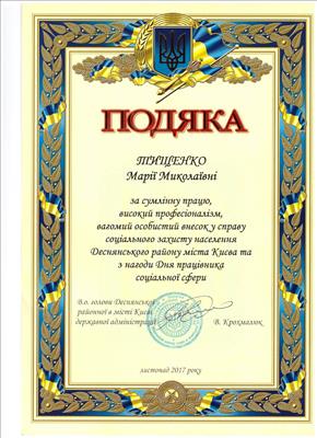 Подяка за сумлінну працю, високий професіоналізм, вагомий особистий внесок у справу соціального захисту населення Деснянського району міста Києва та з нагоди Дня працівника соціальної сфери