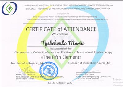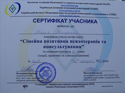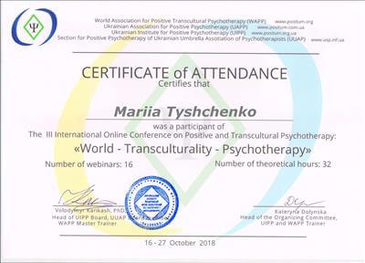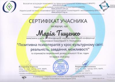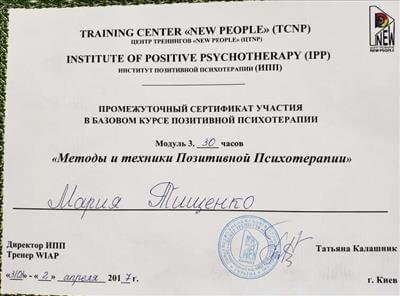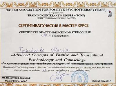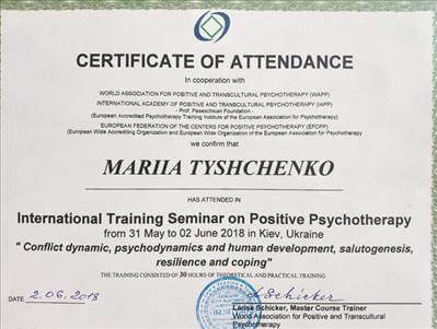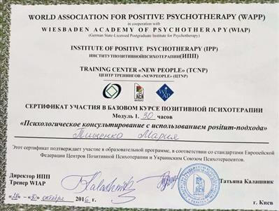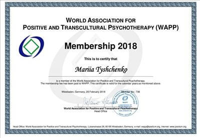 World Association for Positive Transcultural Psychotherapy (WAPP), Ukrainian Association for Positive Psychotherapy, Ukrainian Institute for Positive Psychotherapy (UIPT), Section for Positive Psychotherapy of Ukrainian Umbrella Association of Psychotherapists (UUAP)