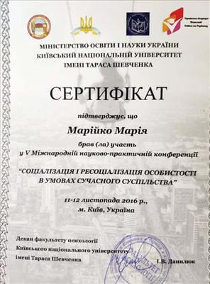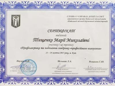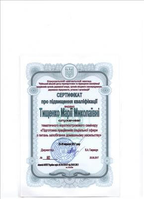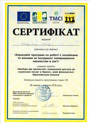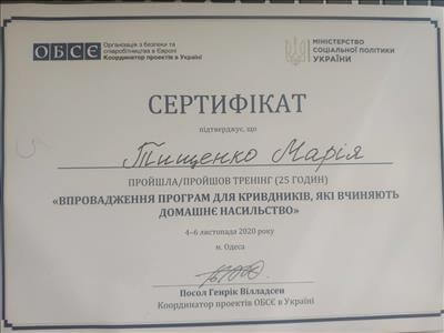 • Київський міський Центр підвищення кваліфікації. Курс підвищення кваліфікації «Підготовка співробітників соціальної сфери з питань запобігання домашньому насильству» (40 годин). Період до: 2017