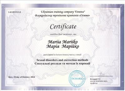 • KISPP (Київський інститут сучасної психології та психотерапії). Курс підвищення кваліфікації «Сексологія» (інтеграція теорії та практики гештальт-підходу Паризької Школи Гештальта (EPG) (автори напрямки Бріджіт Мартель і Гонзаг Маскульє) та психоаналітичного підходу). Спеціалізація: сексологія (1000 годин). Період до: 2014-червень 2015