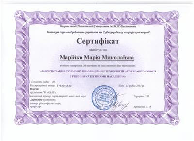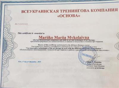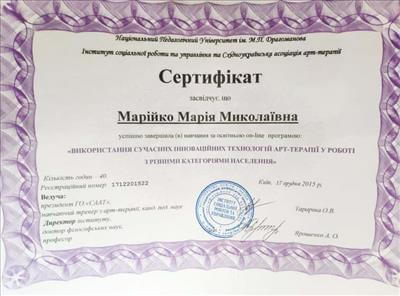 • Східноукраїнська асоціація арт-терапії. Курс підвищення кваліфікації «Арт-терапія» .Спеціалізація: арт-терапія (40 годин) .період діє до: 2015