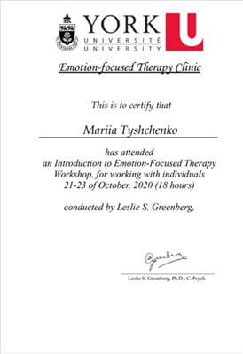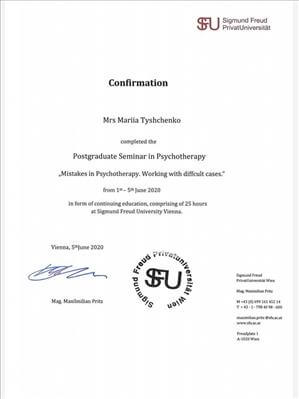 • Отто Кернберг. Психотерапія, сфокусована на переносі. З 2020 по теперішній час. (орієнтовна кількість годин - 200) • Нейропсихоаналіз. Марк Солмс. 2020-2021. (16 годин) • Сучасний гіпноз та гіпнотерапія. Школа Гіпнозу Bright. 2020 (48 годин) • Онлайн Всесвітній пре-конгрес Планета психотерапії. 2020. (35 годин). • Емоційно-фокусована терапія. York University. Канада. 2020 (18 годин) • Конференція. Позитивна психотерапія у кросс-культурному світі. 2020 (10 годин). • П'ята міжнародна онлайн конференція з Позитивної та транскультуральної психотерапії. 2020 (32 години). • Postgraduate seminar in Psychotherpy | Sigmund Freud Privat Universität. Vienna 2020 (25 годин). • Впровадження програм для кривдників, які вчиняють домашнє насильство. Міністерство соціальної політики. 2020. (25 годин).
