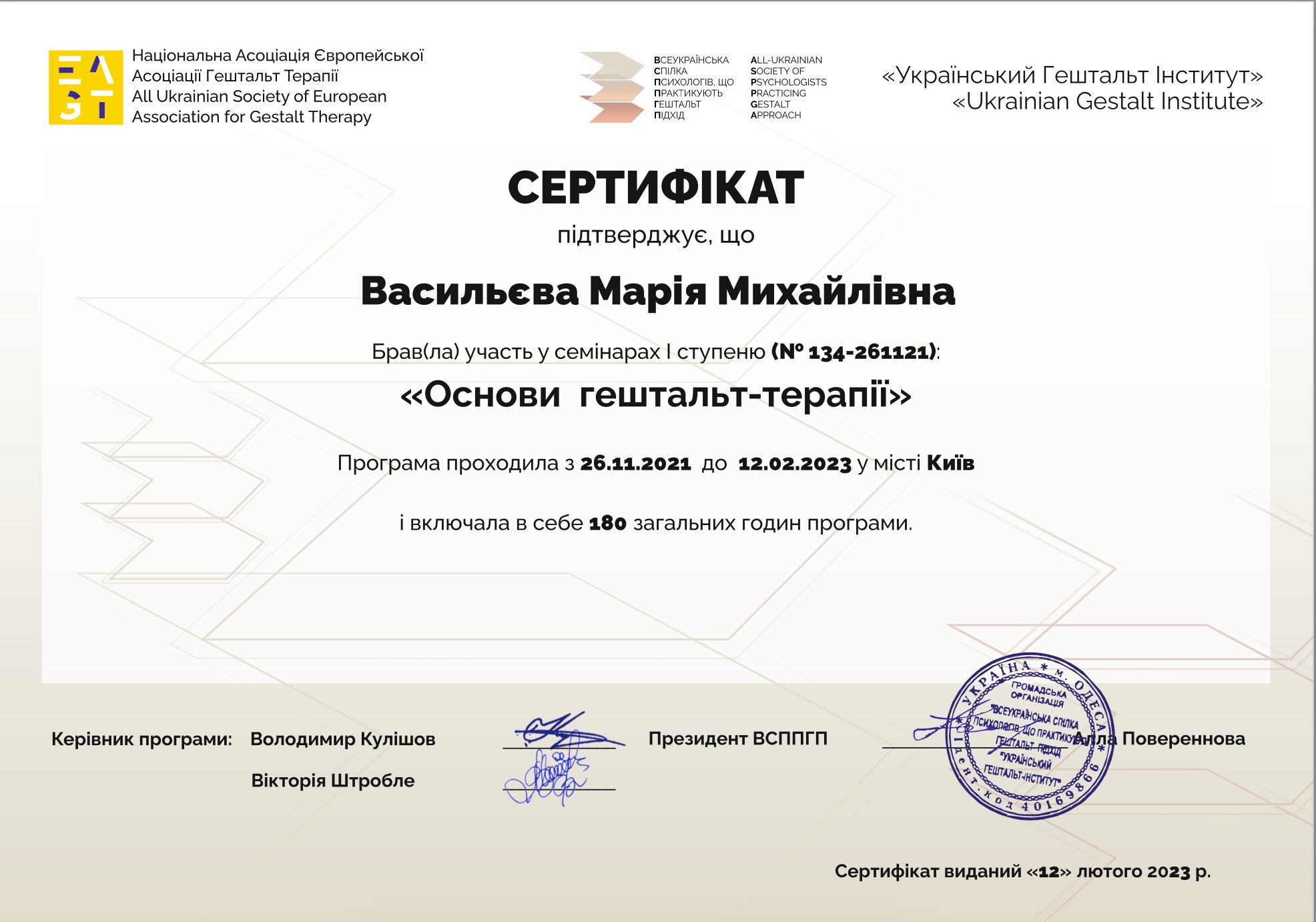 26.11.2021–12.02.2023, Кількість годин - 180