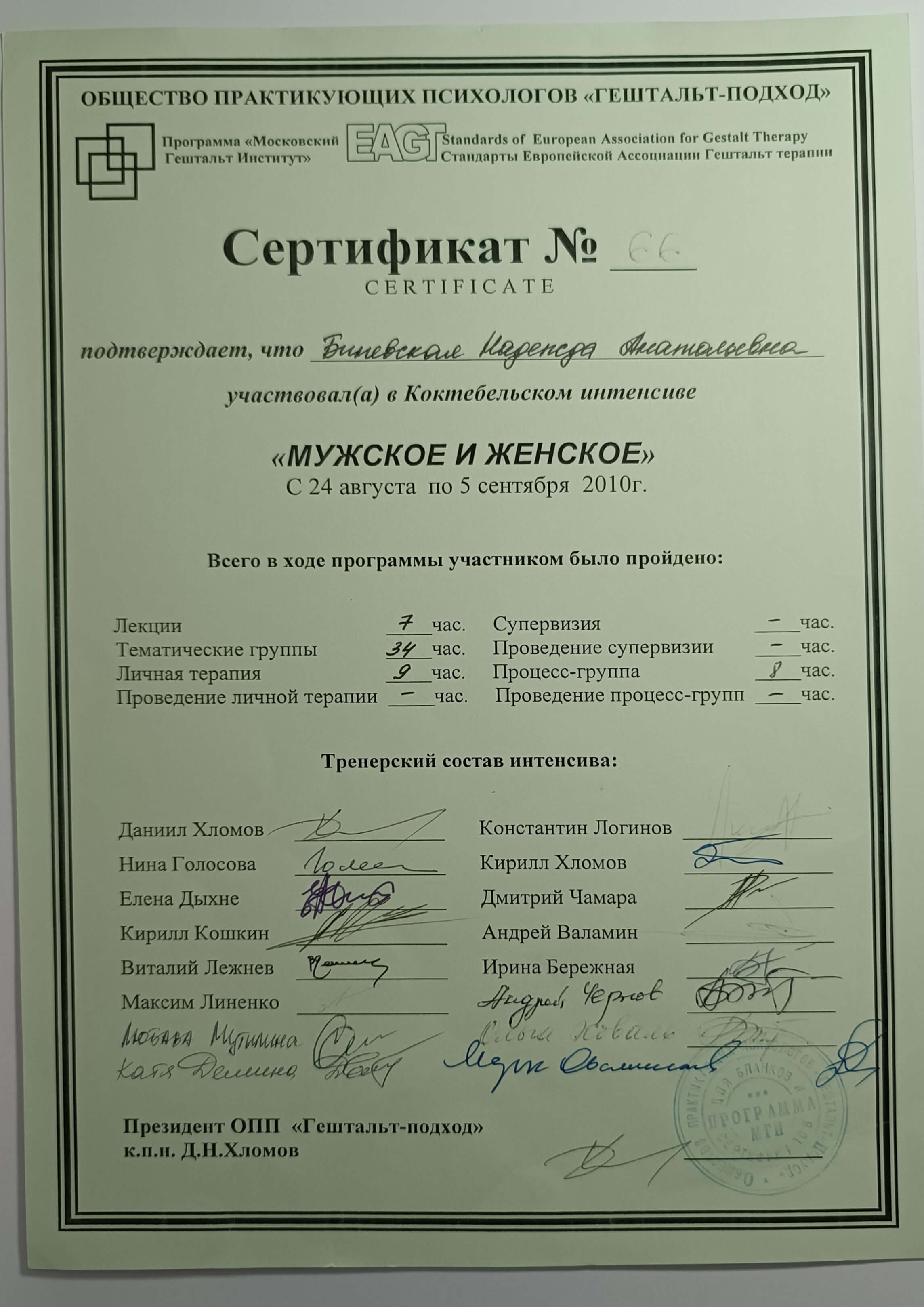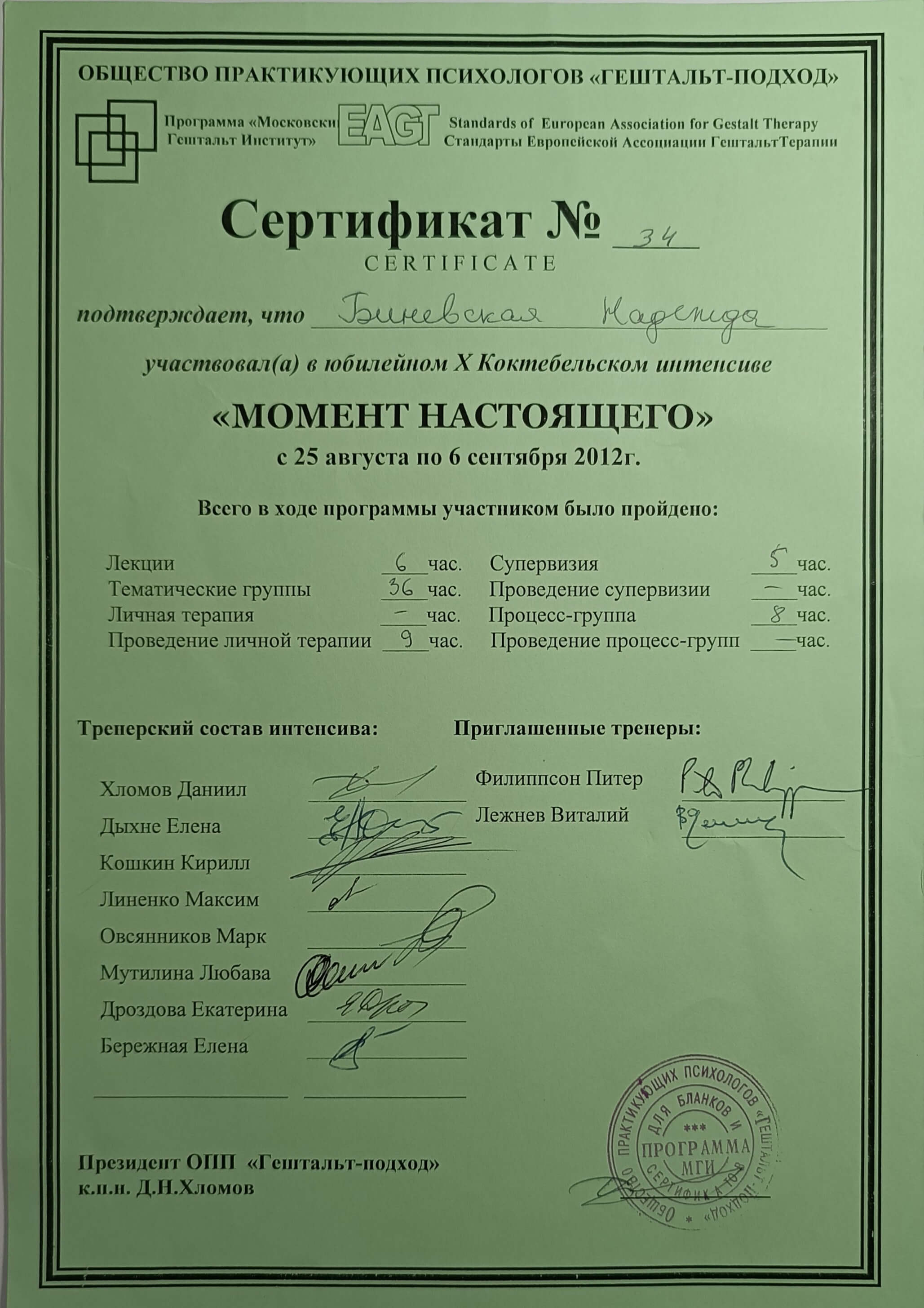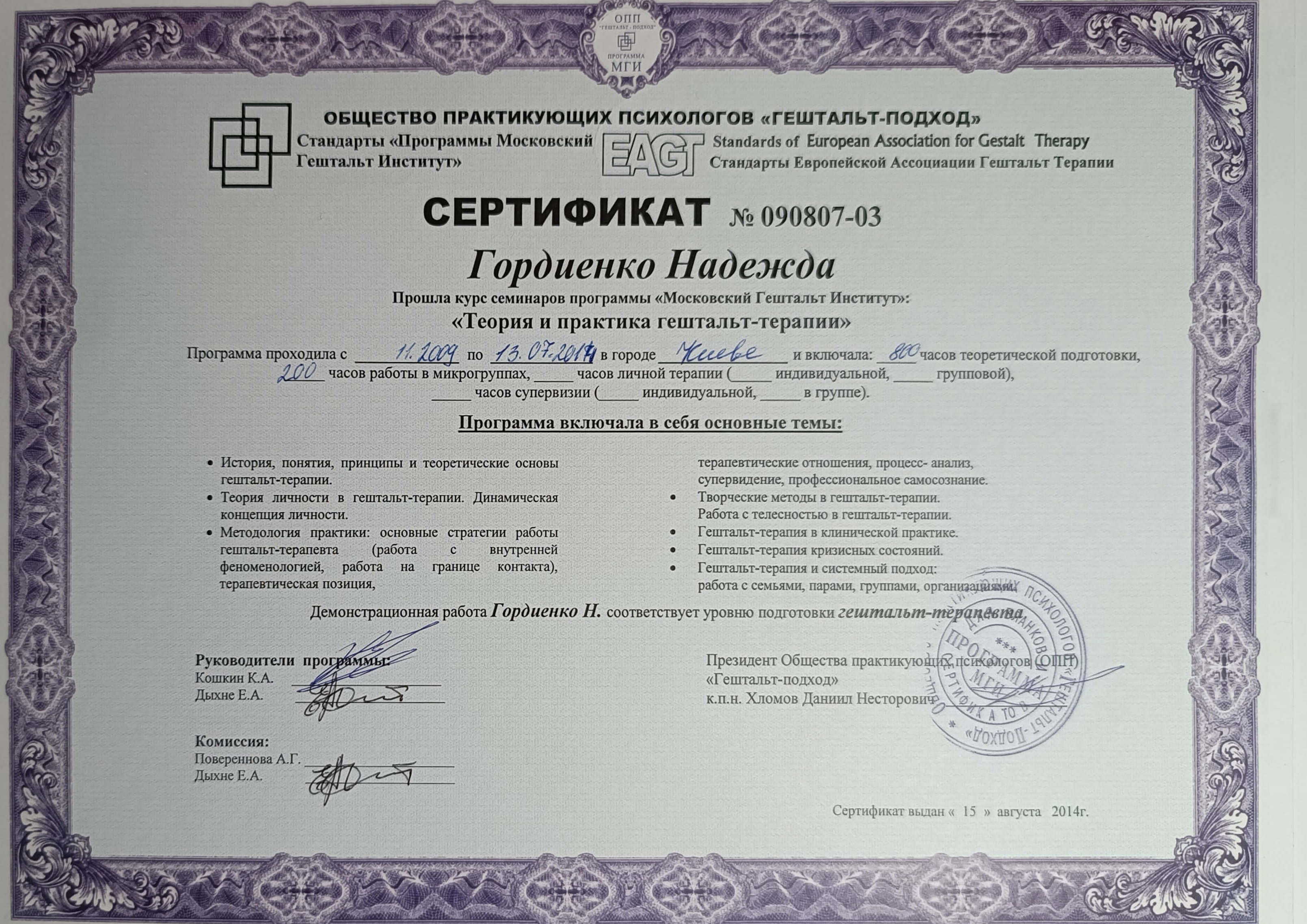 Московський Гештальт Інститут (безумовно сертифікований гештальт-терапевт), 2009-2014р. Курс Кошкіна та Дихне