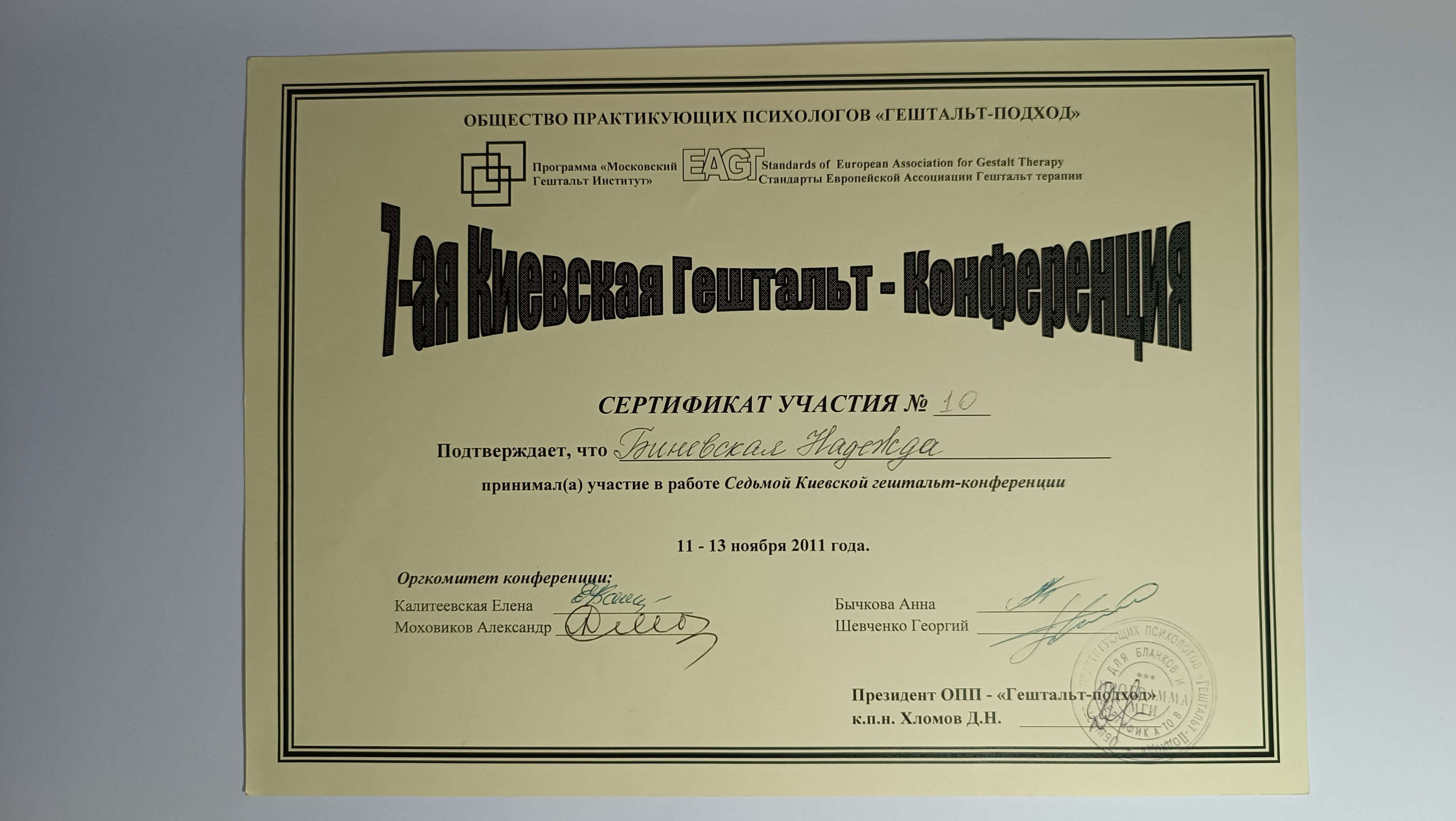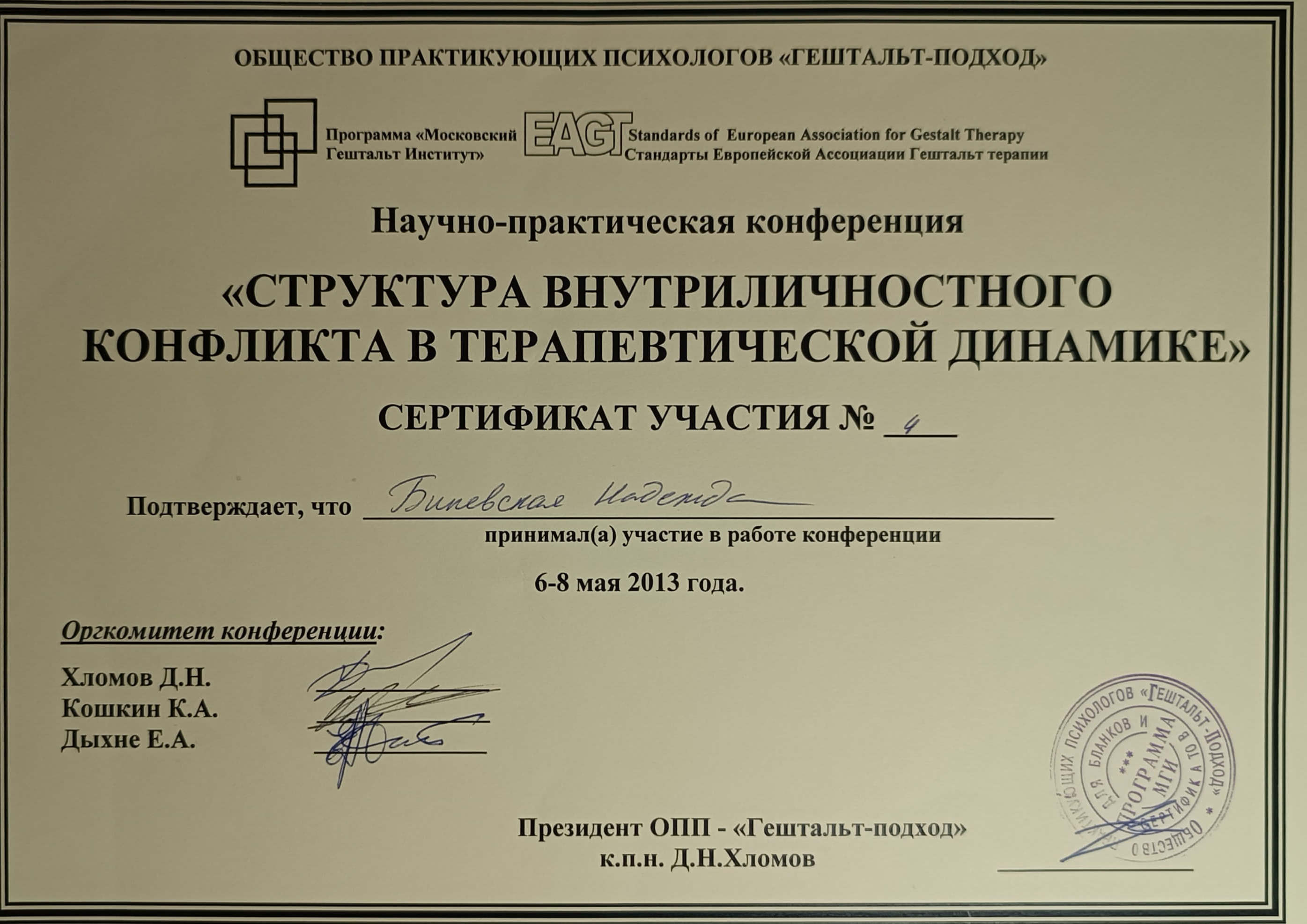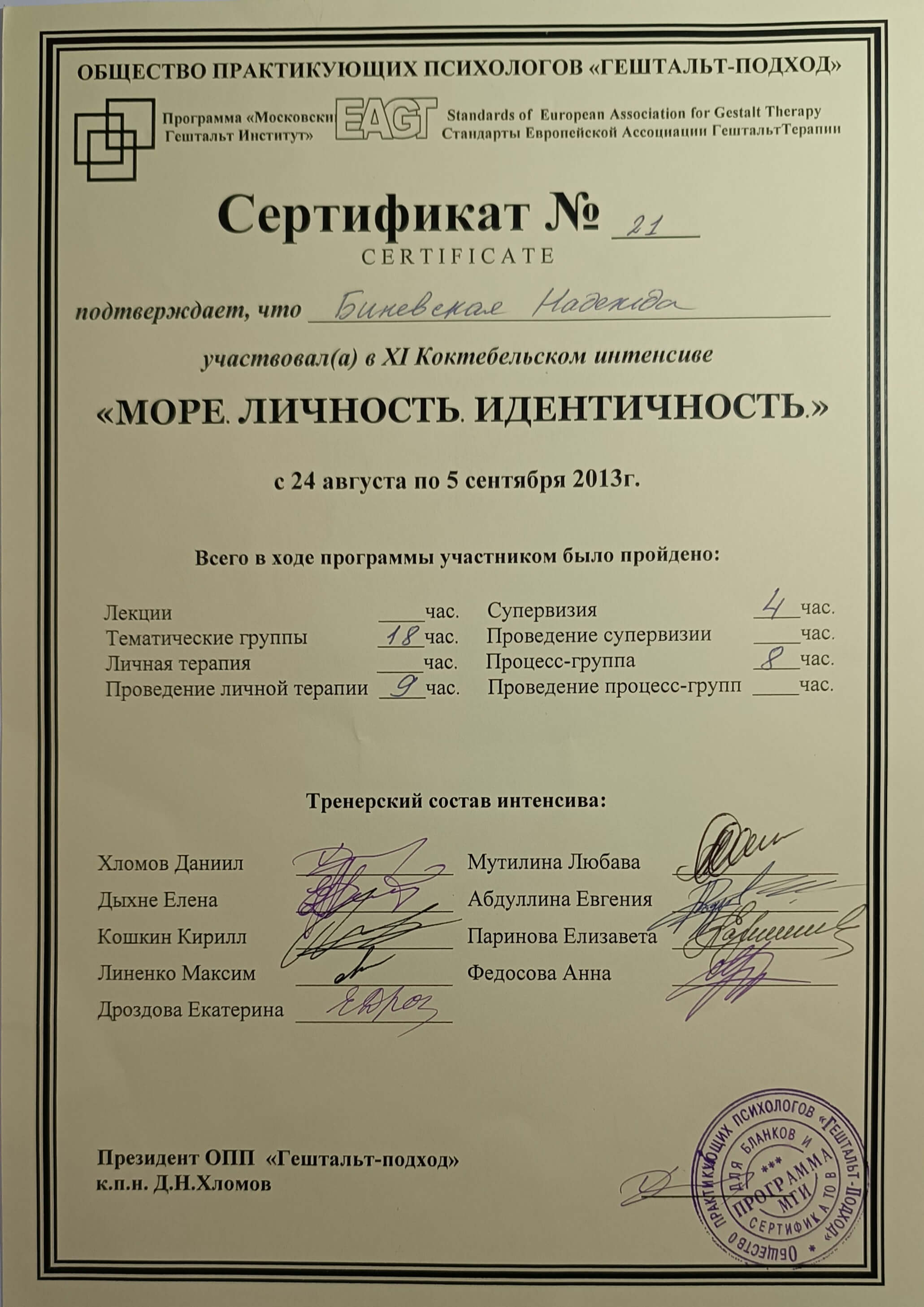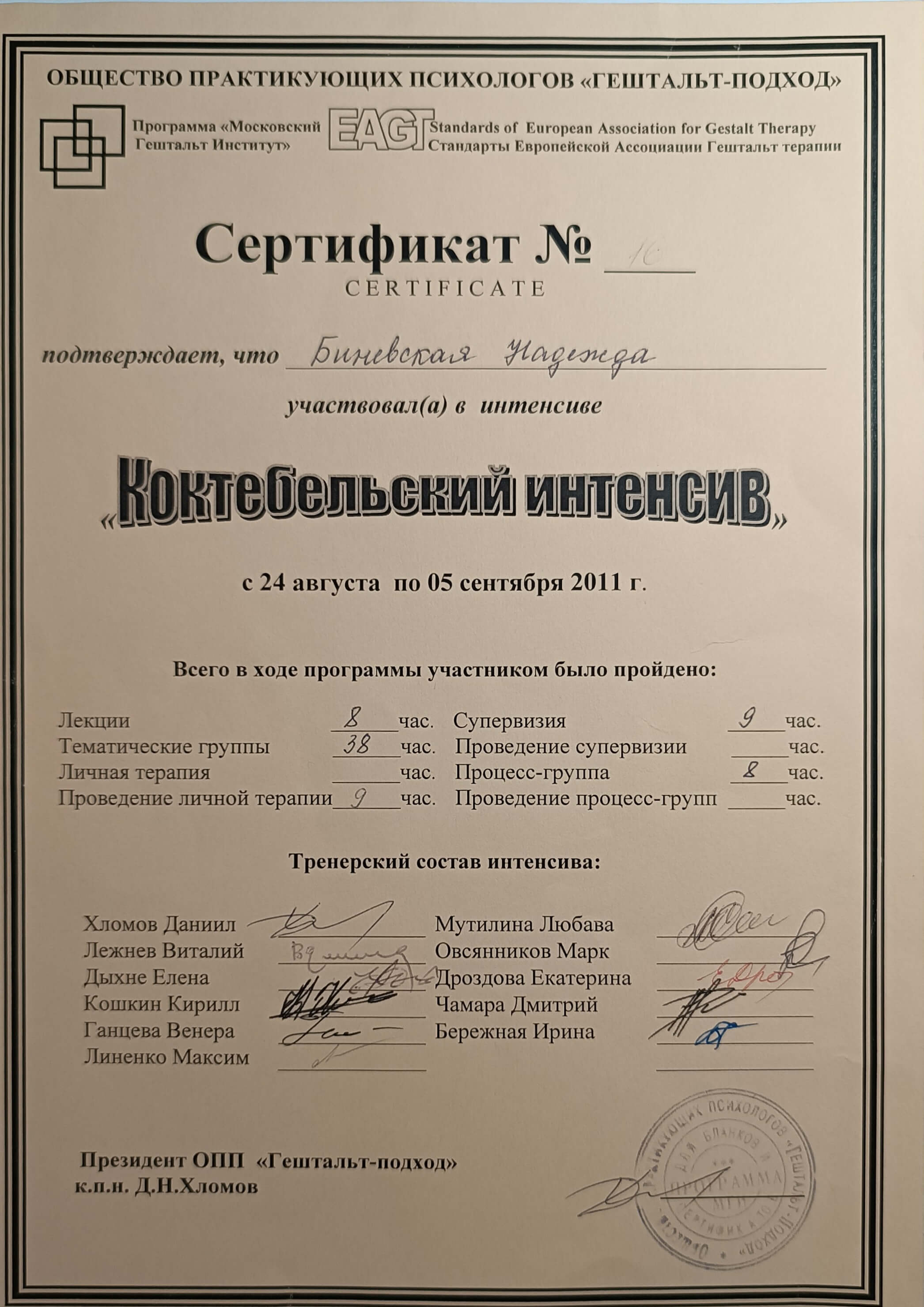 Московський Гештальт Інститут (безумовно сертифікований гештальт-терапевт), 2009-2014р. Курс Кошкіна та Дихне