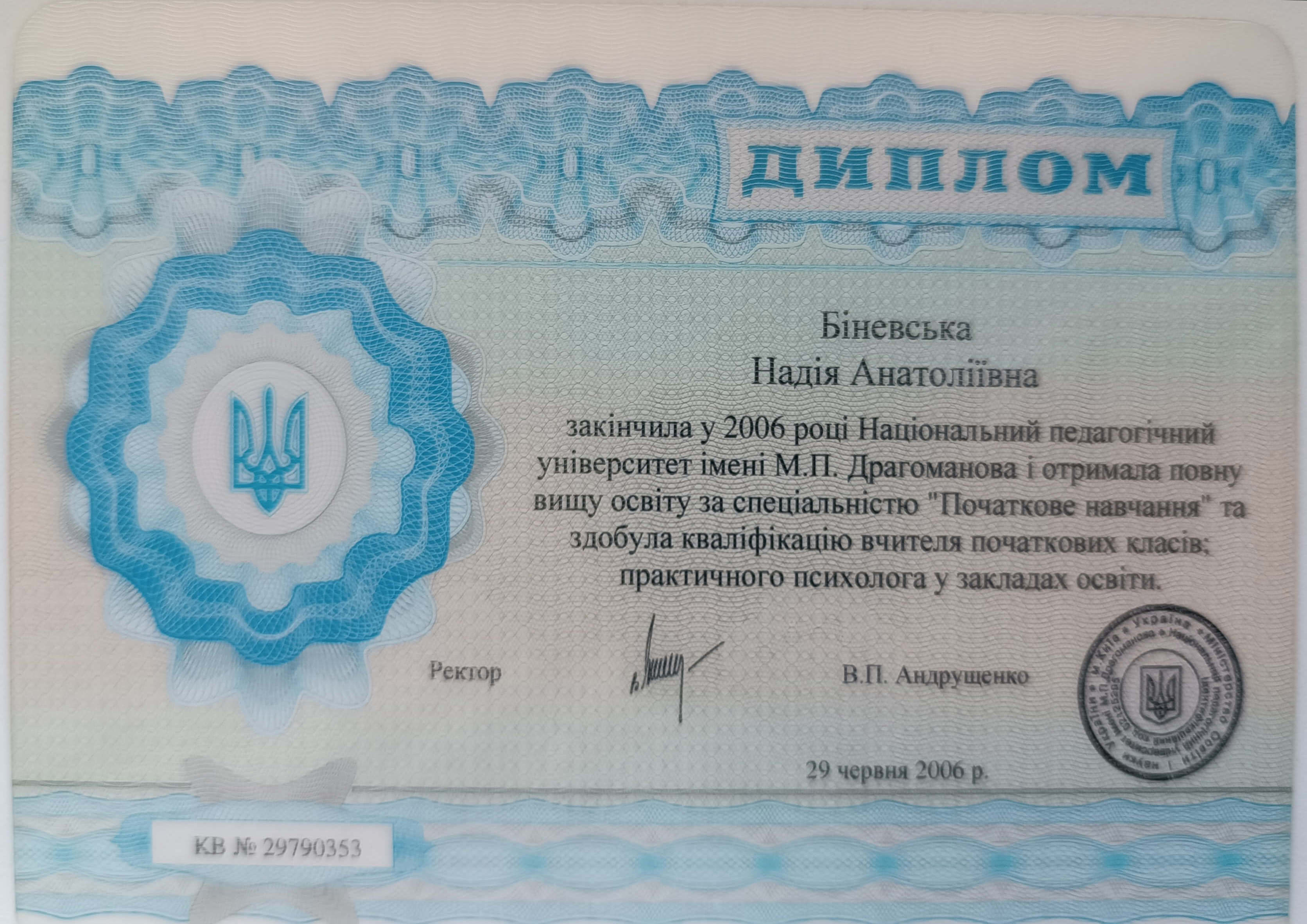 Національний педагогічний університет імені М.П. Драгоманова (практична психологія в освітніх закладах).