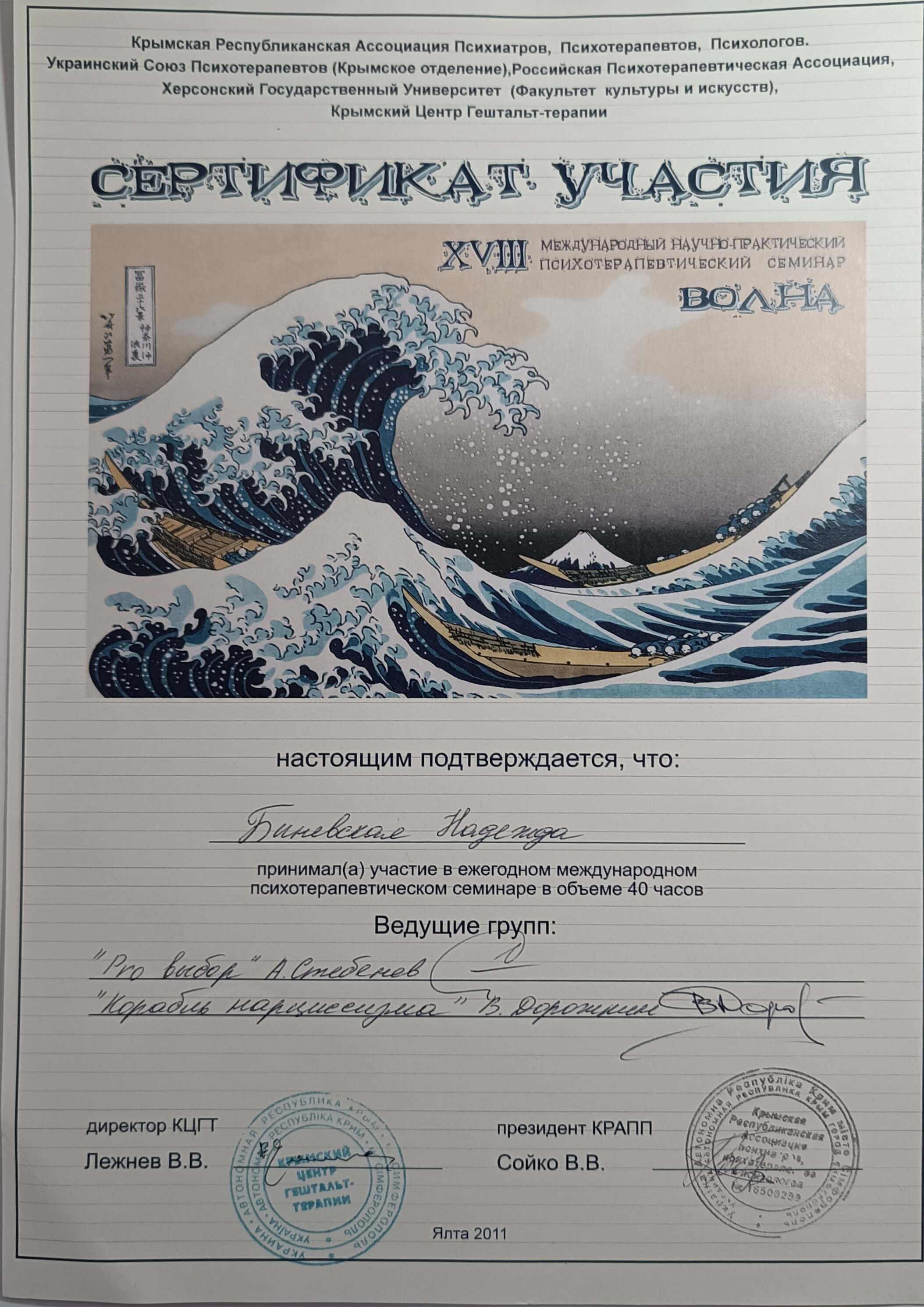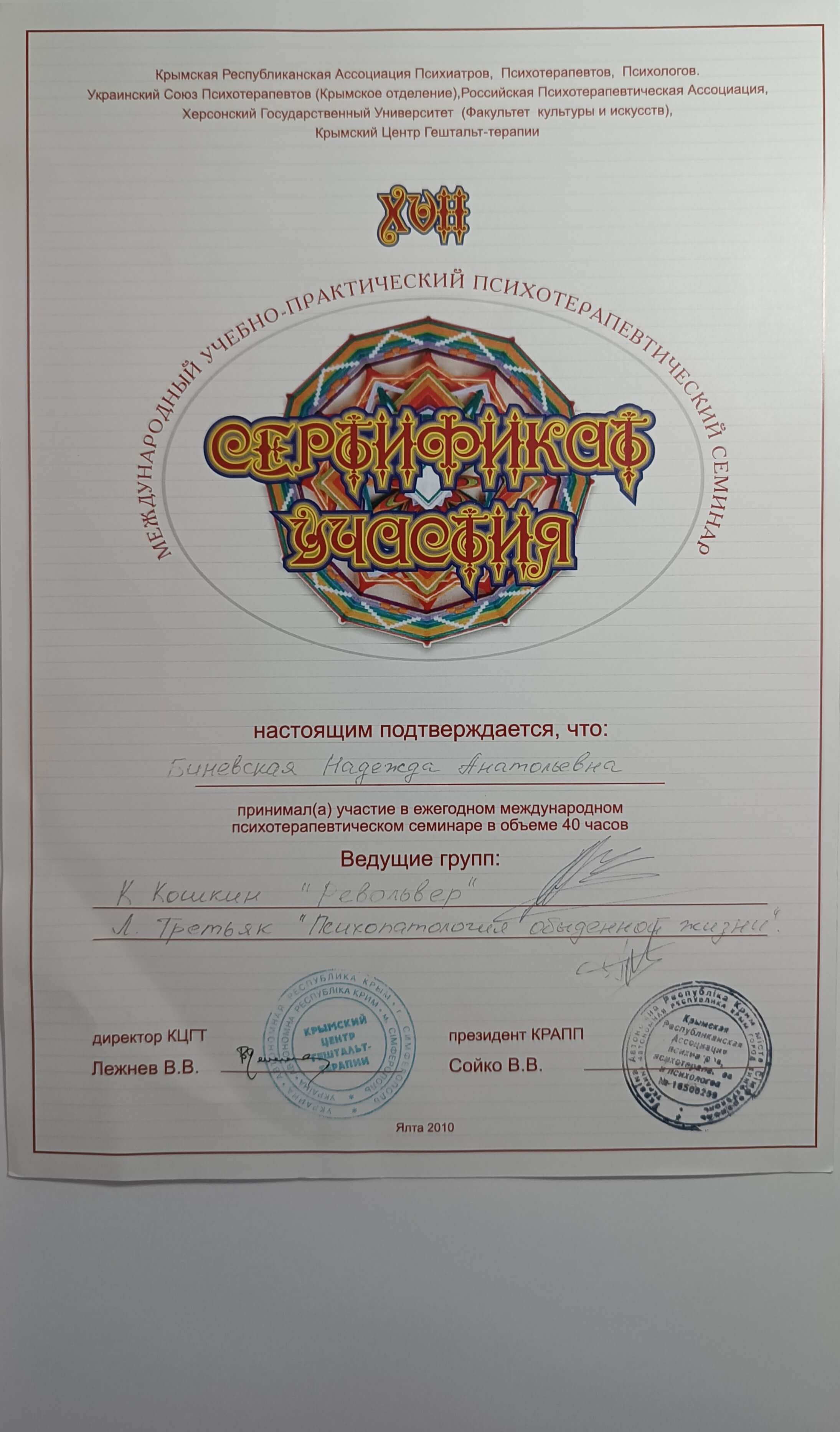 Крымская Республиканская Ассоциация Психиатров, Психотерапевтов, Психологов; Украинский Союз Психотерапевтов (Крымское отделение); Российская Психотерапевтическая Ассоциация; Херсонский Государственный Университет (Факультет культуры и искусств); Крымский Центр Гештальт-терапии