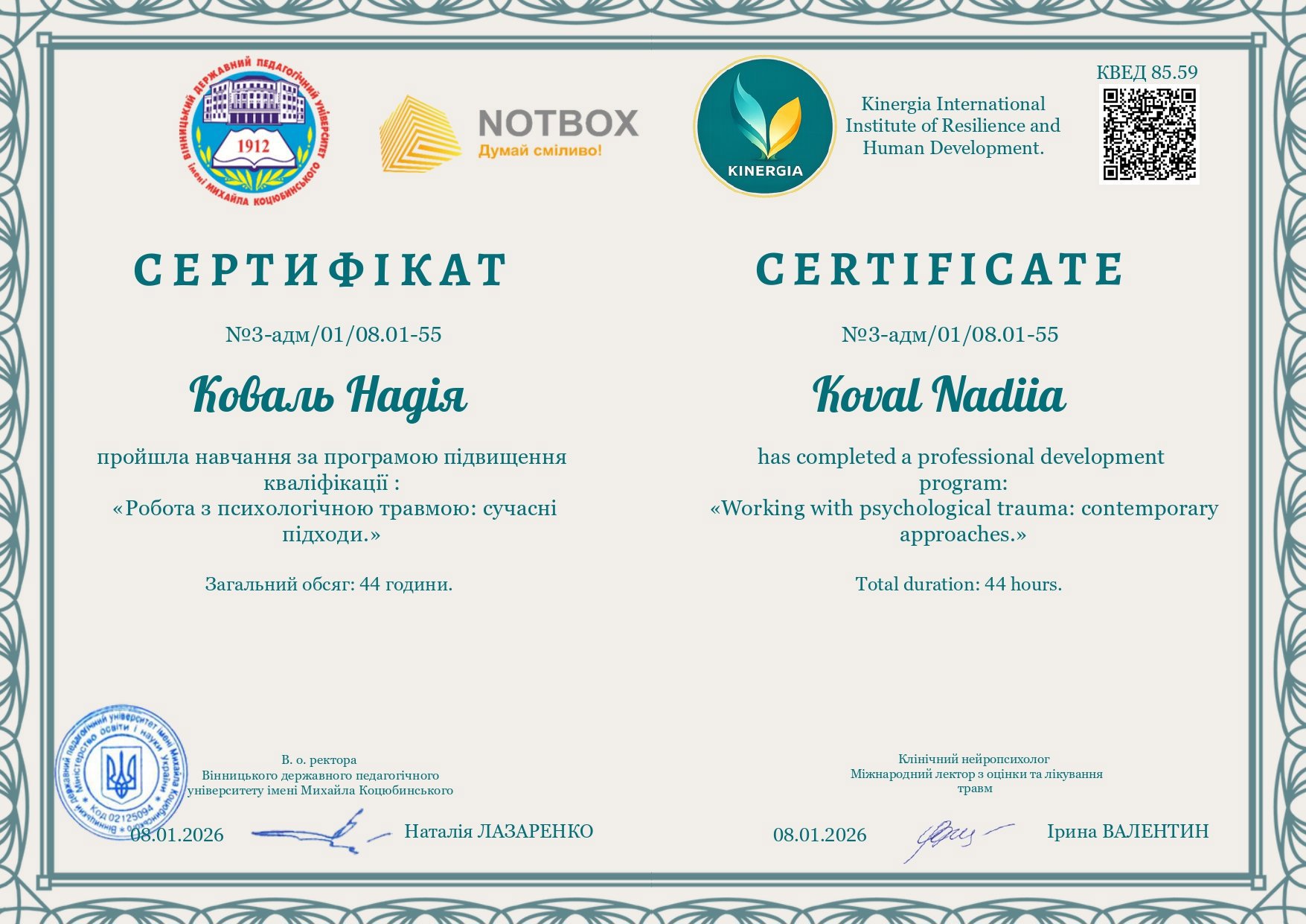 "Пропедевтика психіатричних захворювань для психологів." " Робота з психологычною травмою: сучасні підходи."