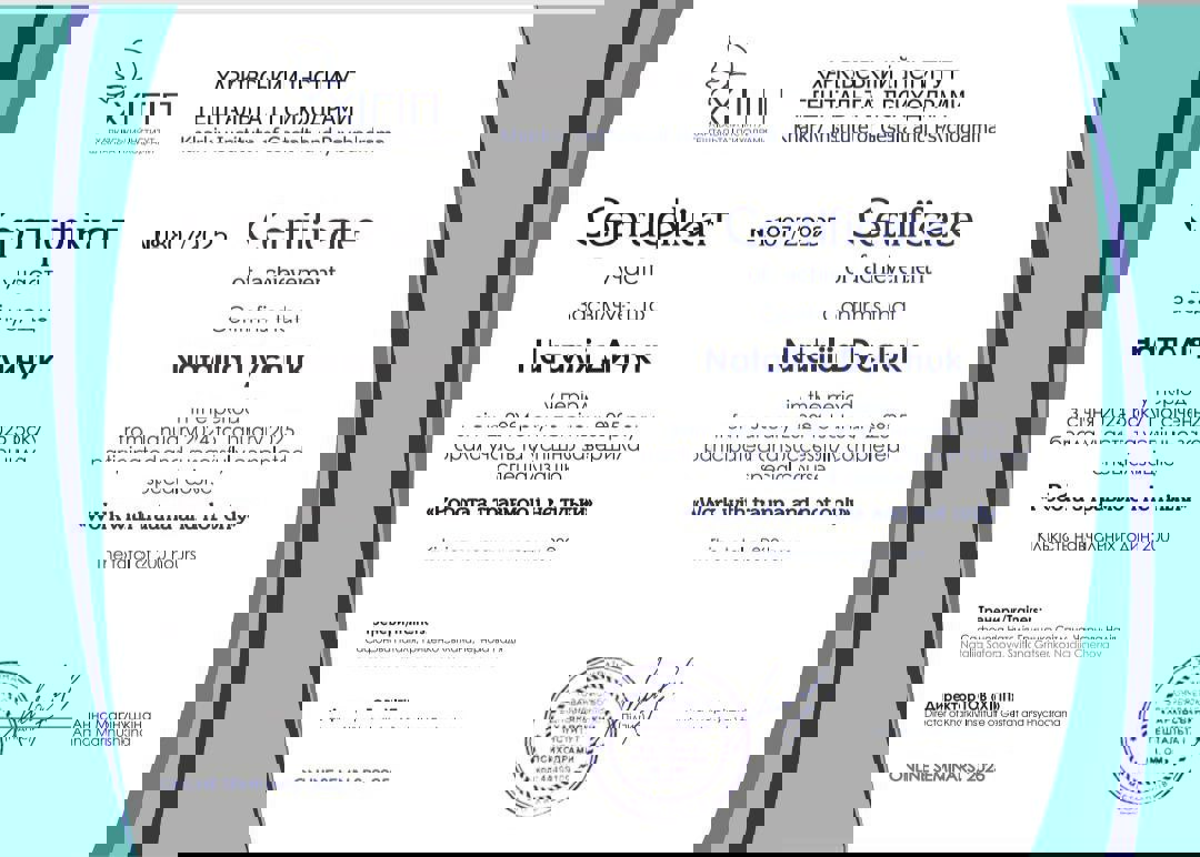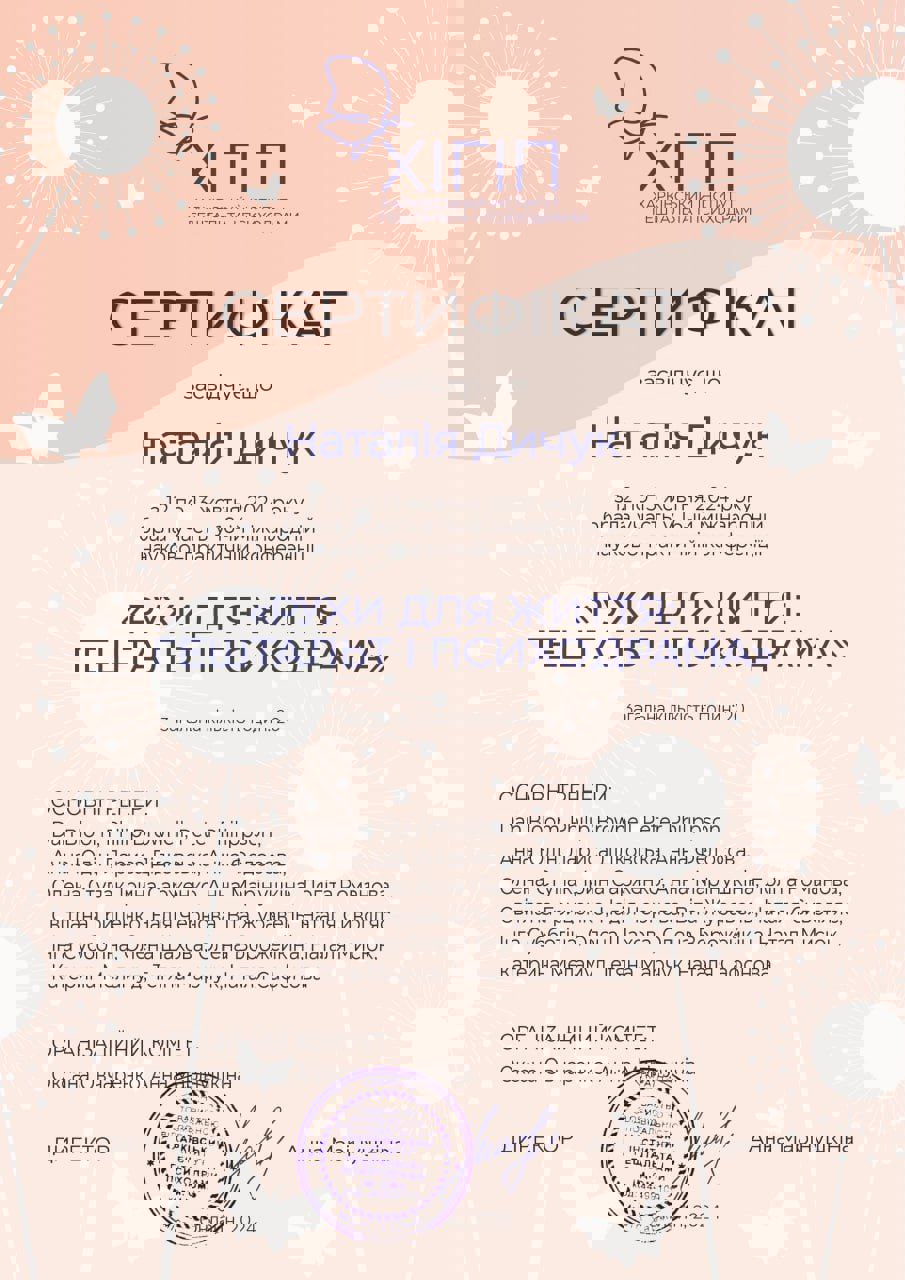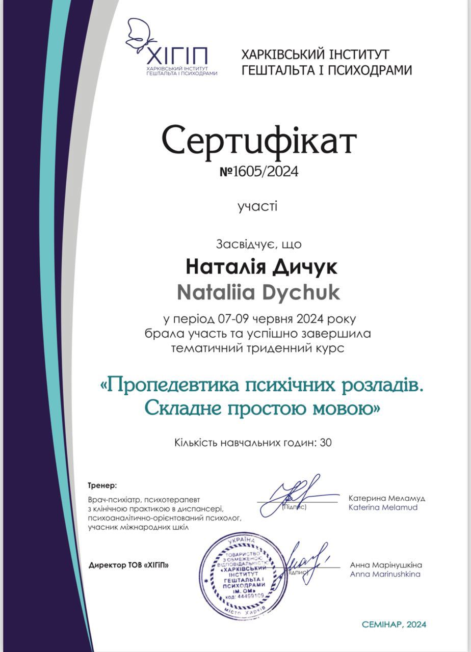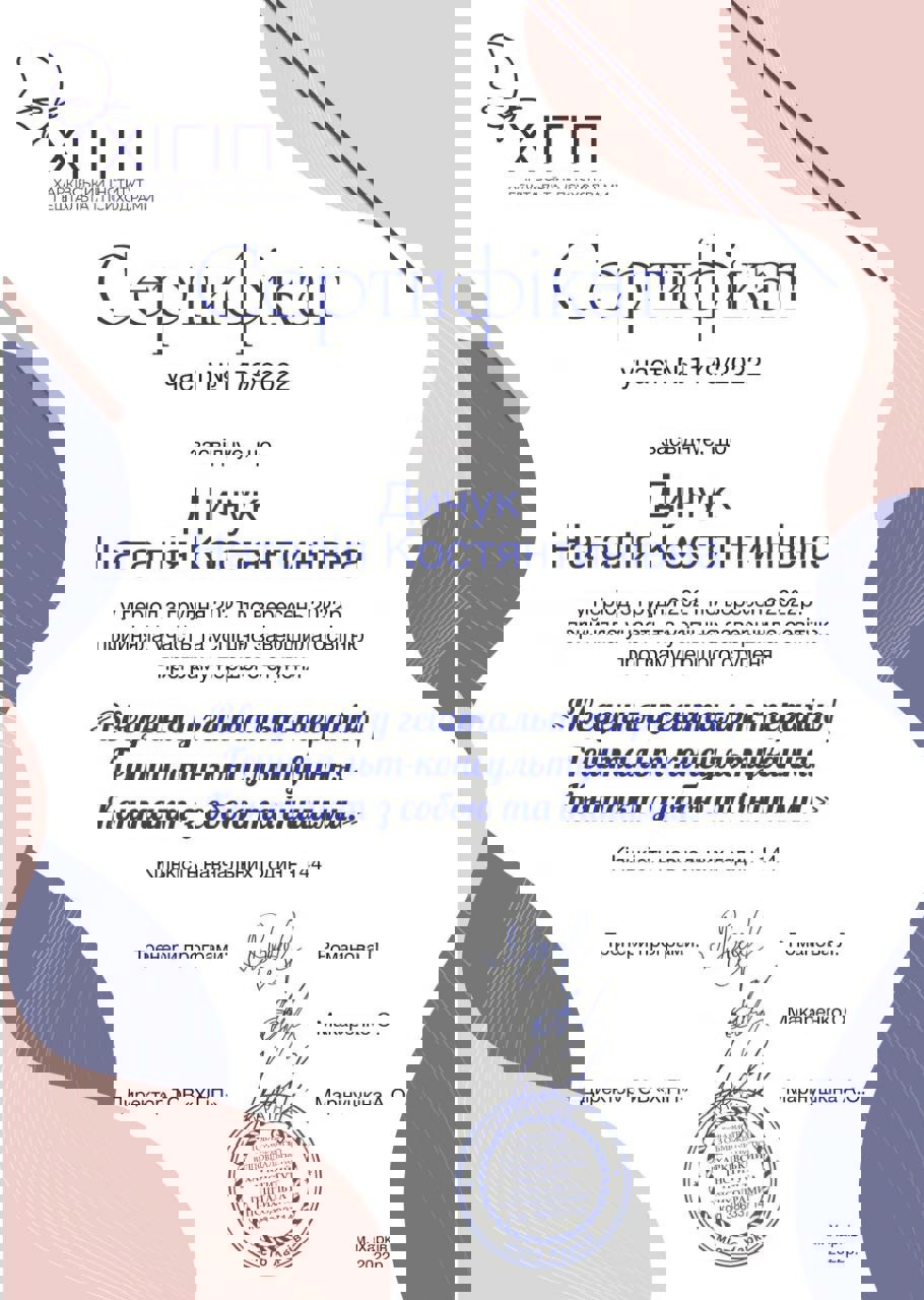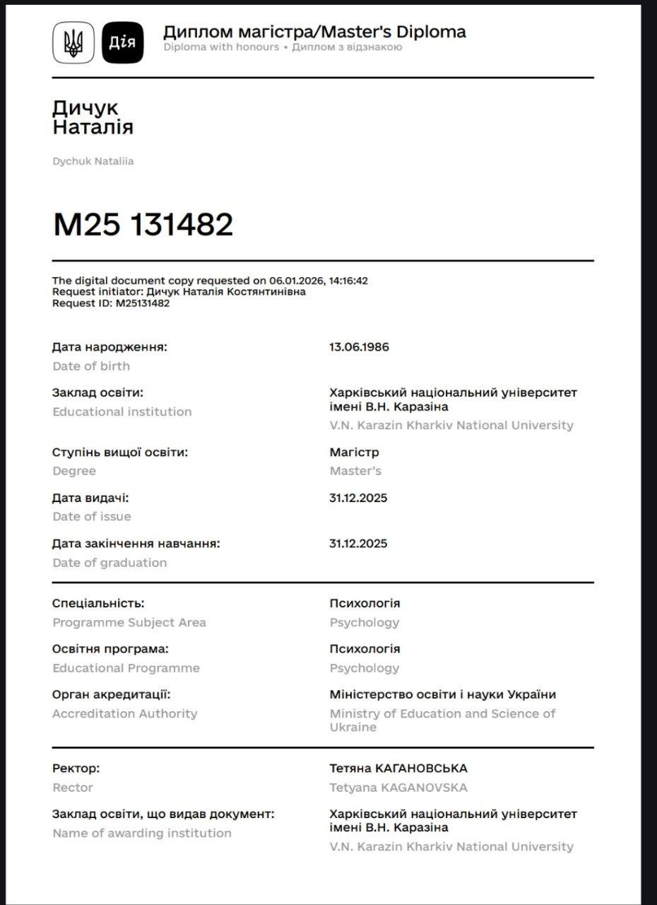 Магістр Психології. Другий Ступень у Харківьскому Інституті Гештальту та Психодрами. Пройшла Спеціалізацію з Травми та успішно сертифікувалася. Пройшла курс з Проведевтики. Маю індивідуальну супервізію, індивідуальну терапію та супервізорську групу.