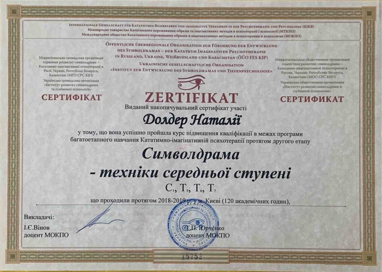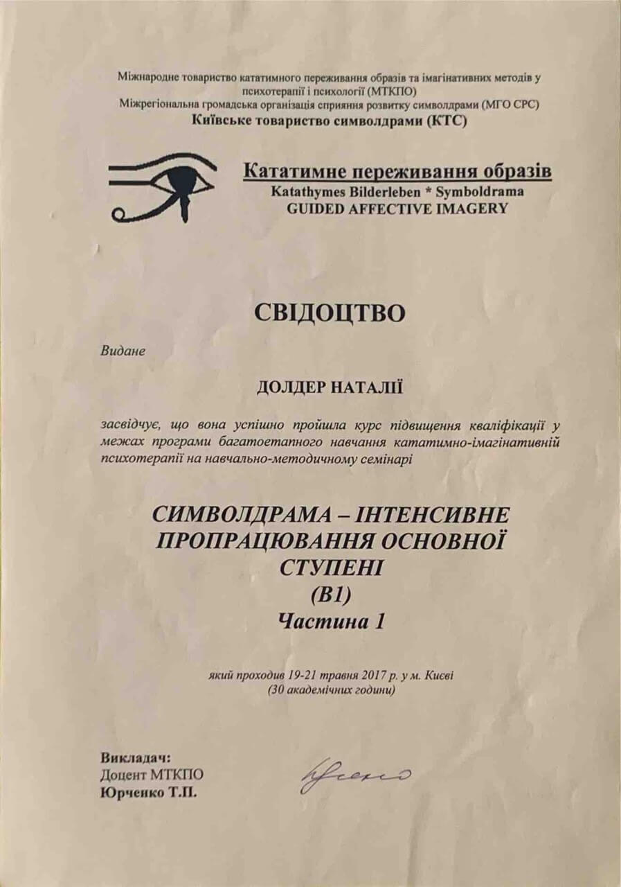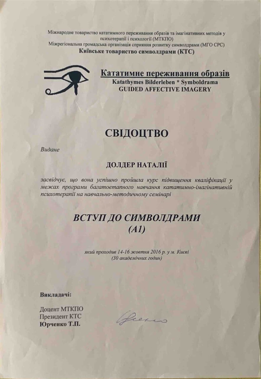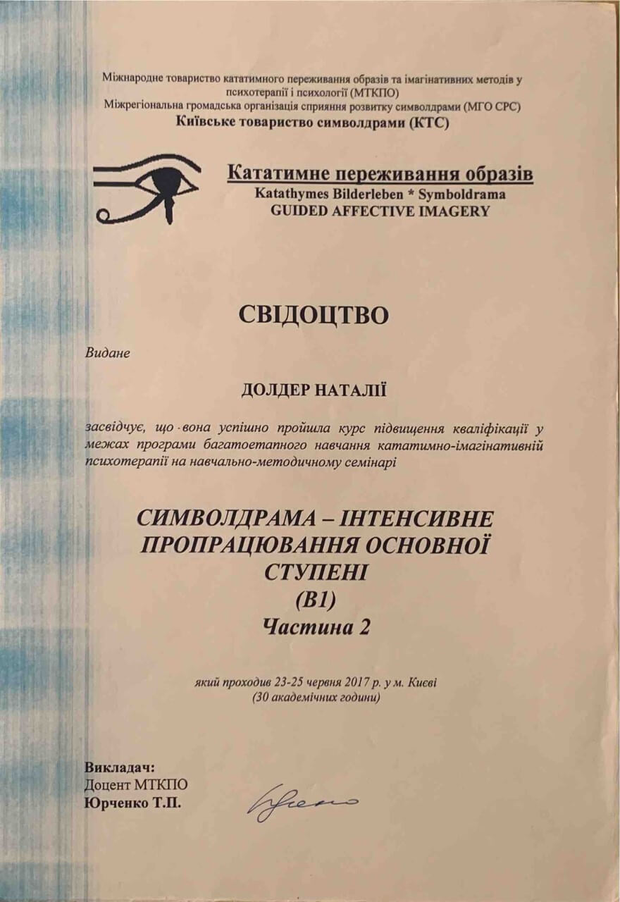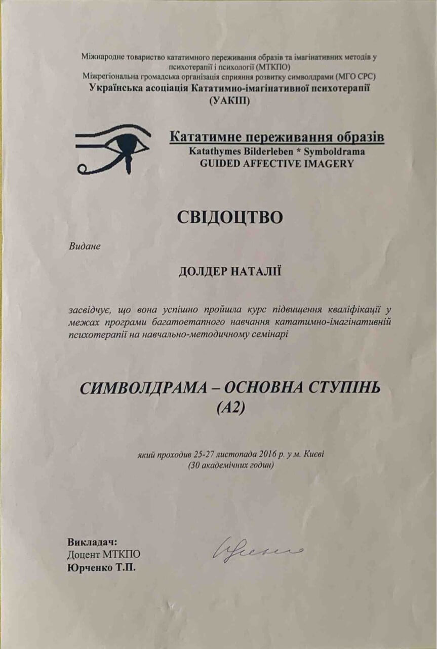 З 2016-2021 Міжрегіональна громадська організація сприяння розвитку символдрами - Кататимно-імагінавтивної психотерапії в Росії, Україні, Республіки Білорусь, Казахстані (МГО СРС КВП) Українська громадська організація «Інститут розвитку символдрами та глибинної психології» Закінчила навчання, готуюся до сда.