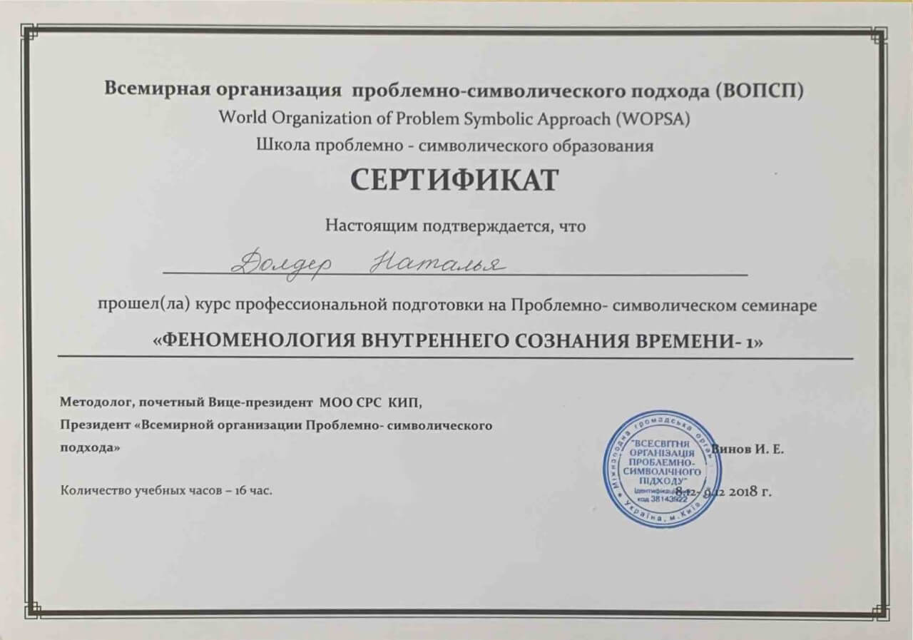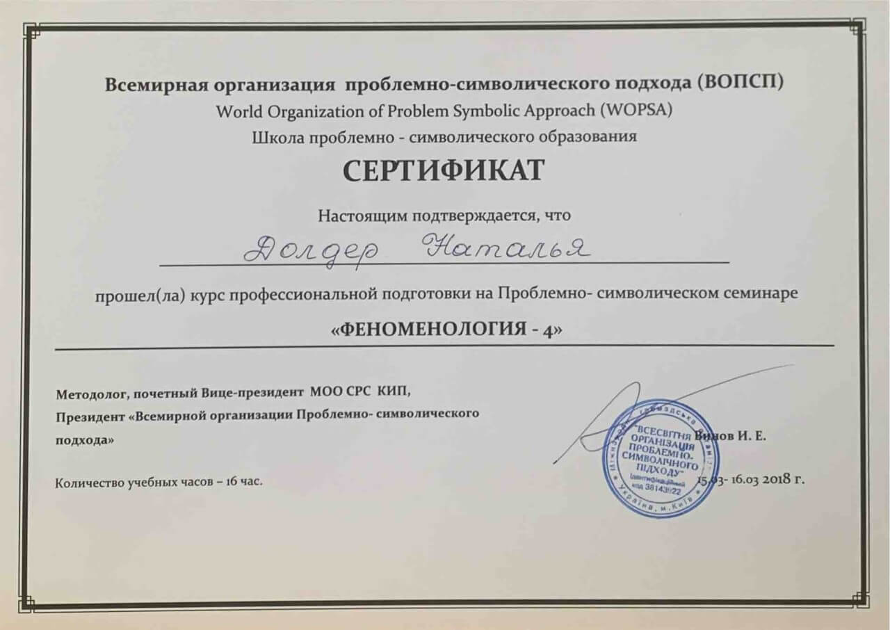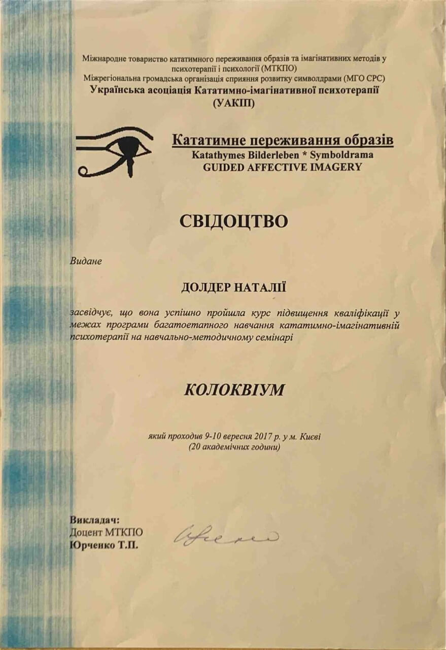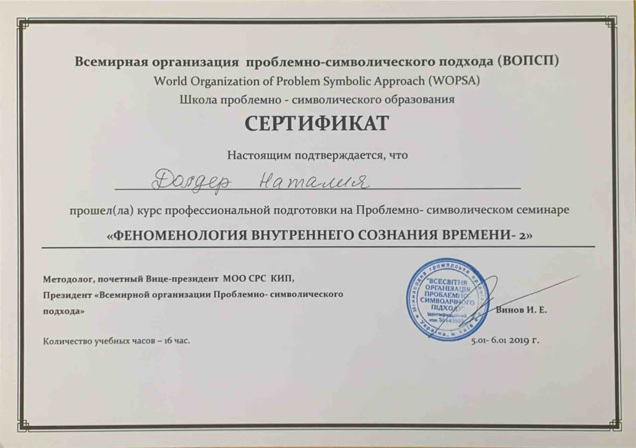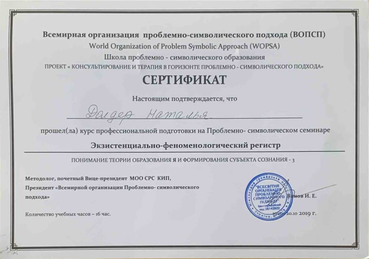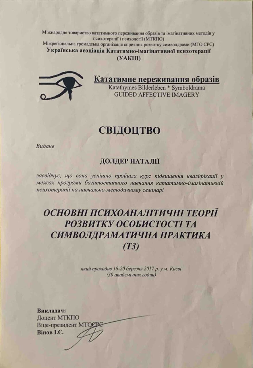 З 2016-2021 Міжрегіональна громадська організація сприяння розвитку символдрами - Кататимно-імагінавтивної психотерапії в Росії, Україні, Республіки Білорусь, Казахстані (МГО СРС КВП) Українська громадська організація «Інститут розвитку символдрами та глибинної психології» Закінчила навчання, готуюся до сда.