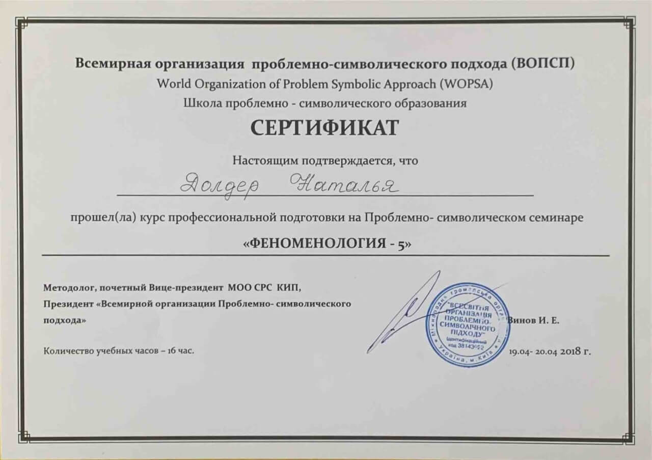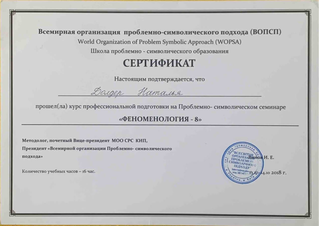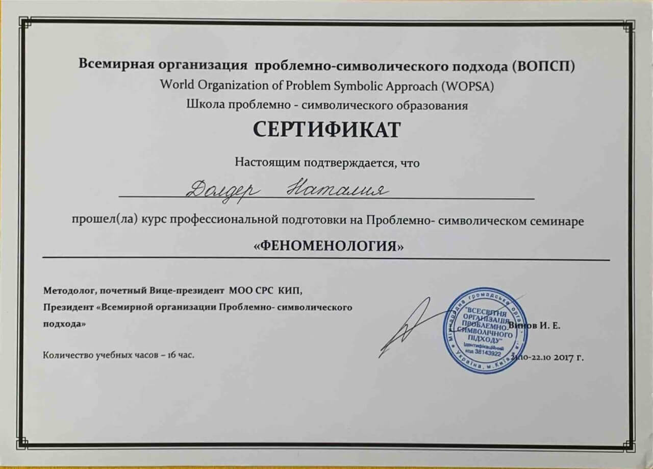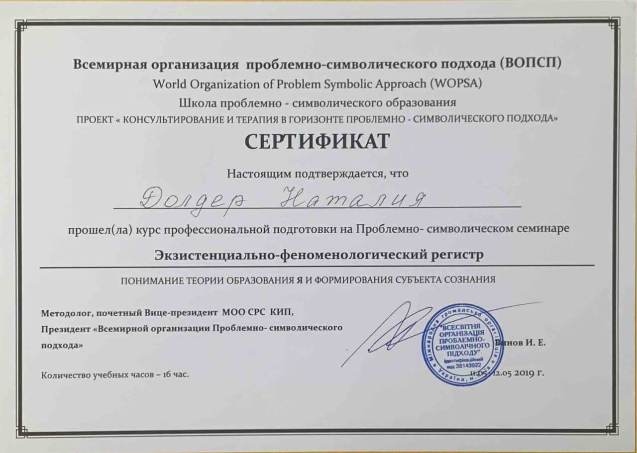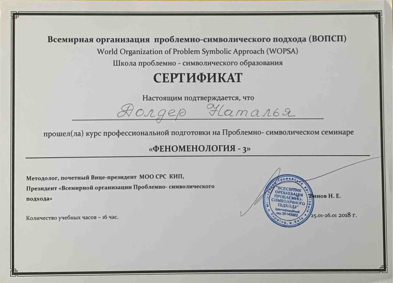 З 2016-2021 Міжрегіональна громадська організація сприяння розвитку символдрами - Кататимно-імагінавтивної психотерапії в Росії, Україні, Республіки Білорусь, Казахстані (МГО СРС КВП) Українська громадська організація «Інститут розвитку символдрами та глибинної психології» Закінчила навчання, готуюся до сда.