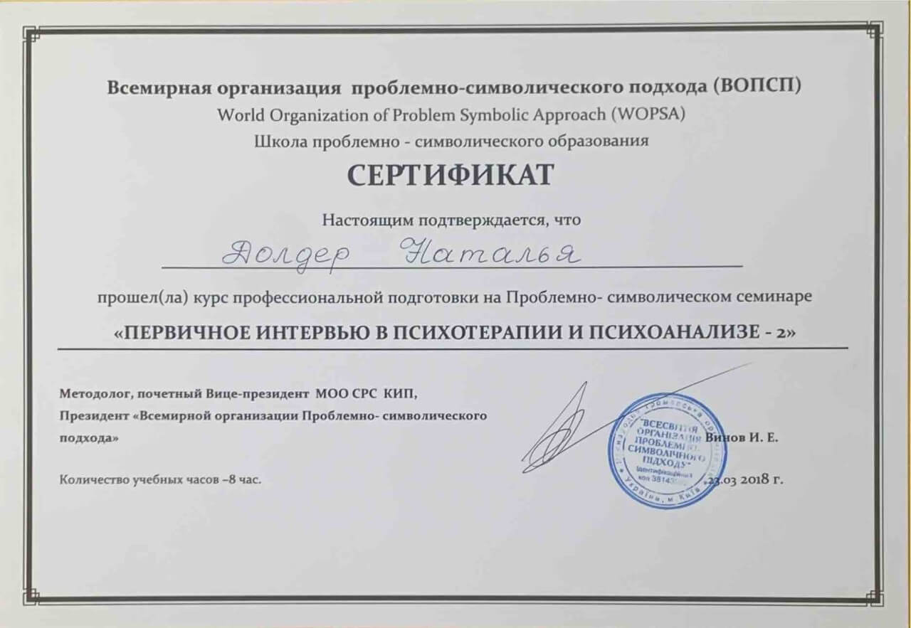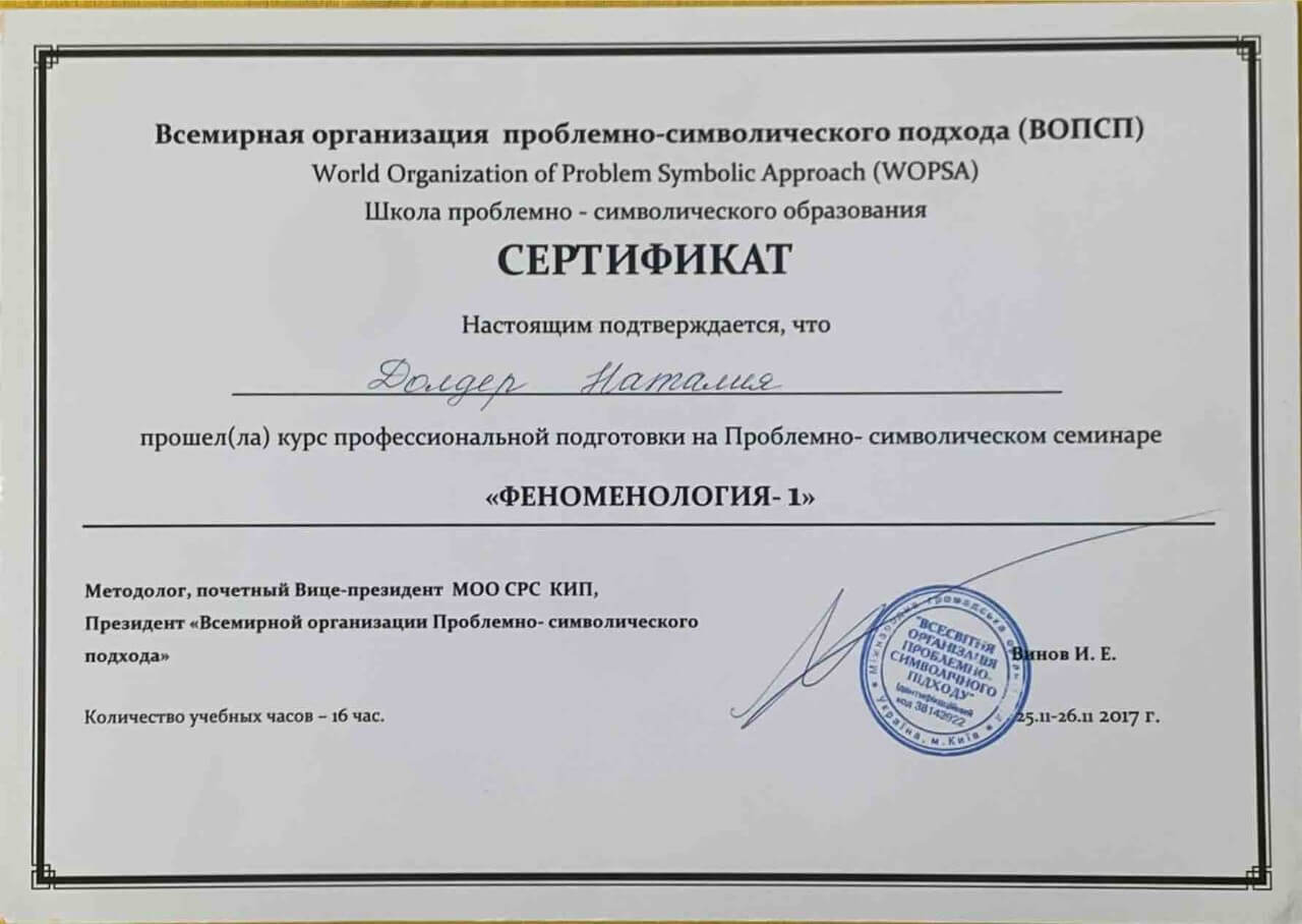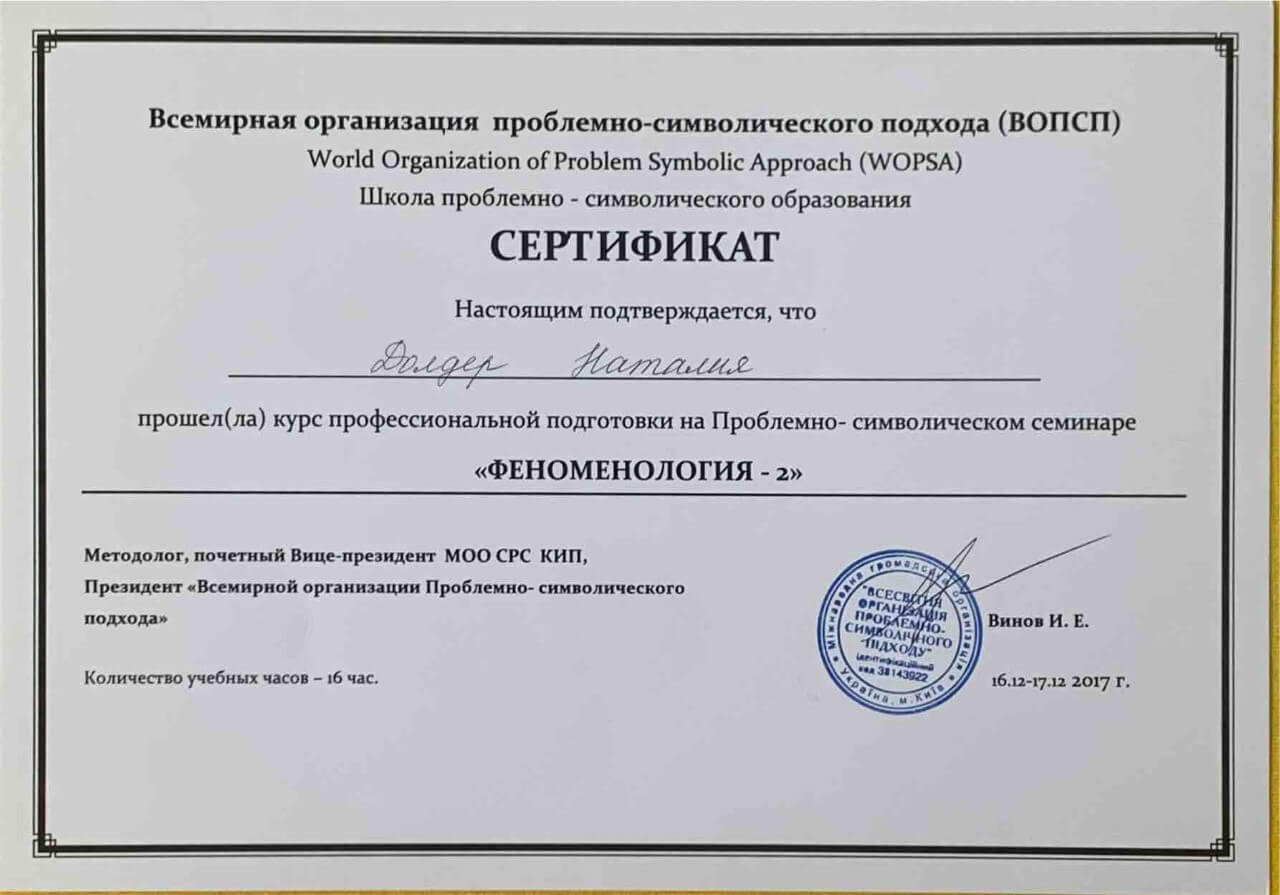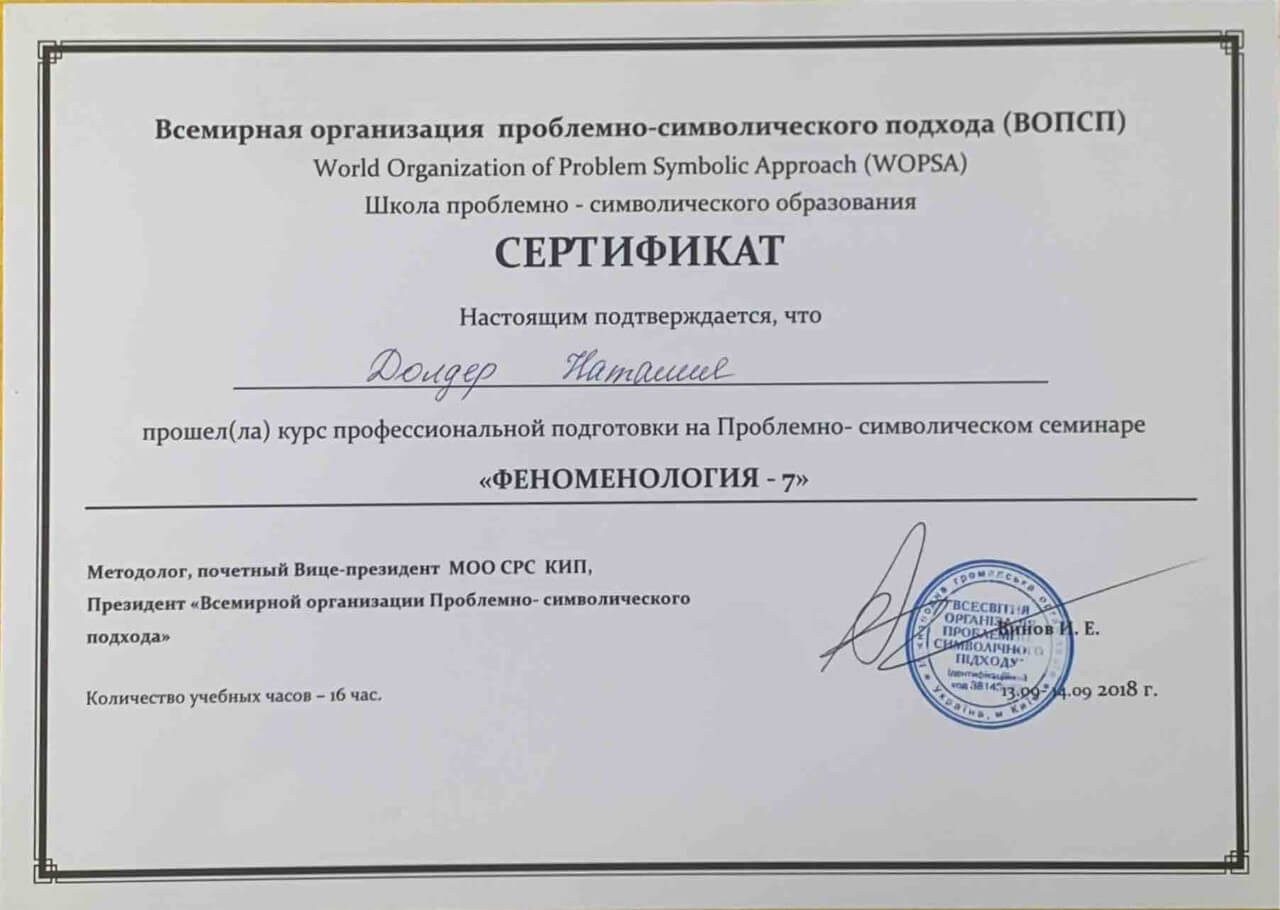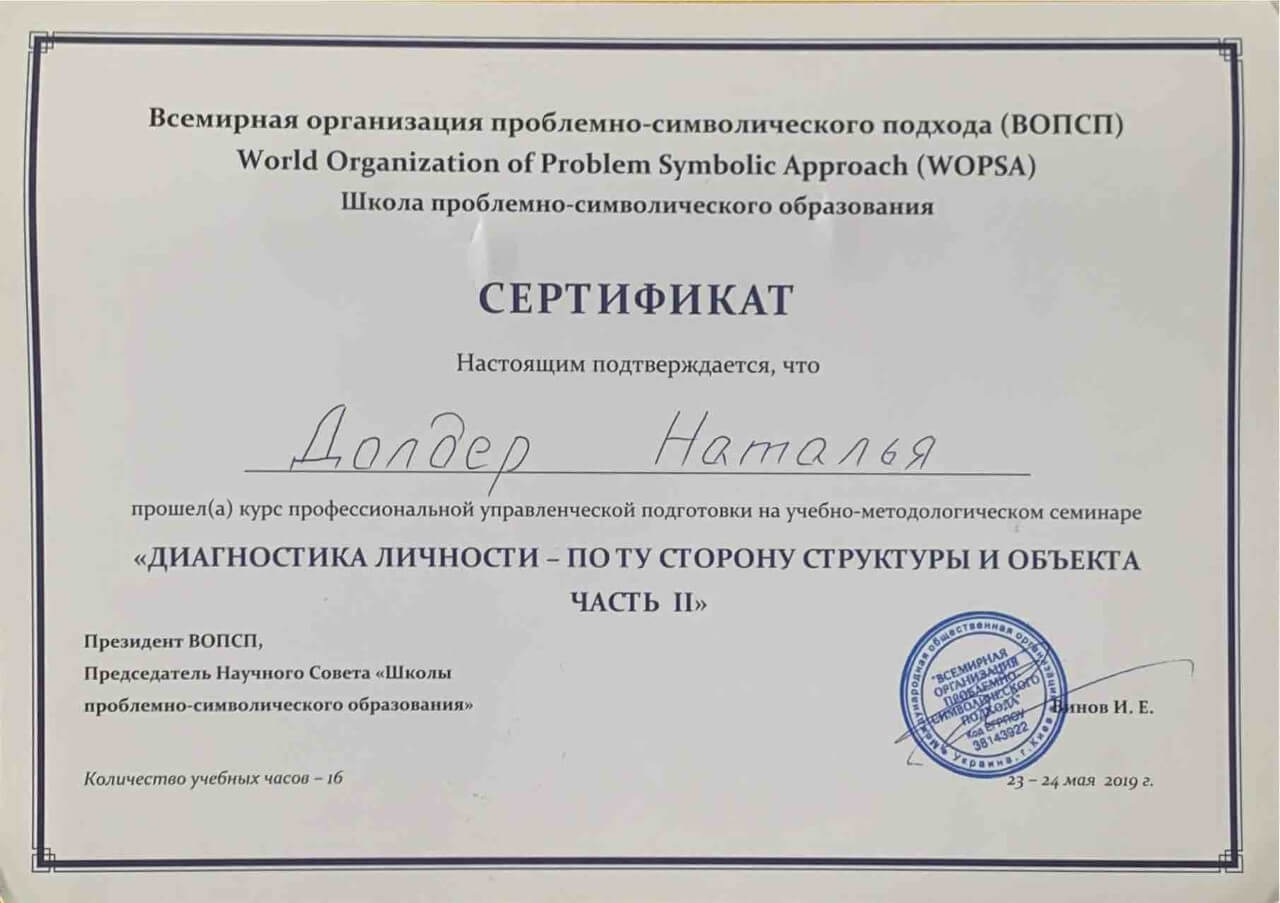З 2016-2021 Міжрегіональна громадська організація сприяння розвитку символдрами - Кататимно-імагінавтивної психотерапії в Росії, Україні, Республіки Білорусь, Казахстані (МГО СРС КВП) Українська громадська організація «Інститут розвитку символдрами та глибинної психології» Закінчила навчання, готуюся до сда.