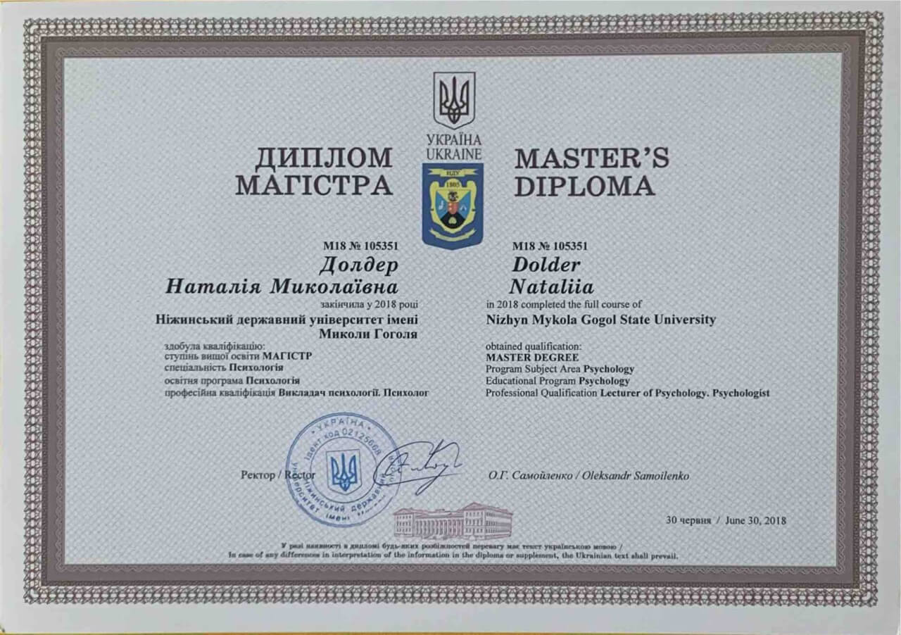 Закінчила 2018 Ніжинський державний університет ім. Миколи Гоголя здобула кваліфікацію: ступінь вищої освіти МАГІСТР, спеціальність Психологія, освітня програма Психологія, професійна кваліфікація Викладач психології. Психолог.