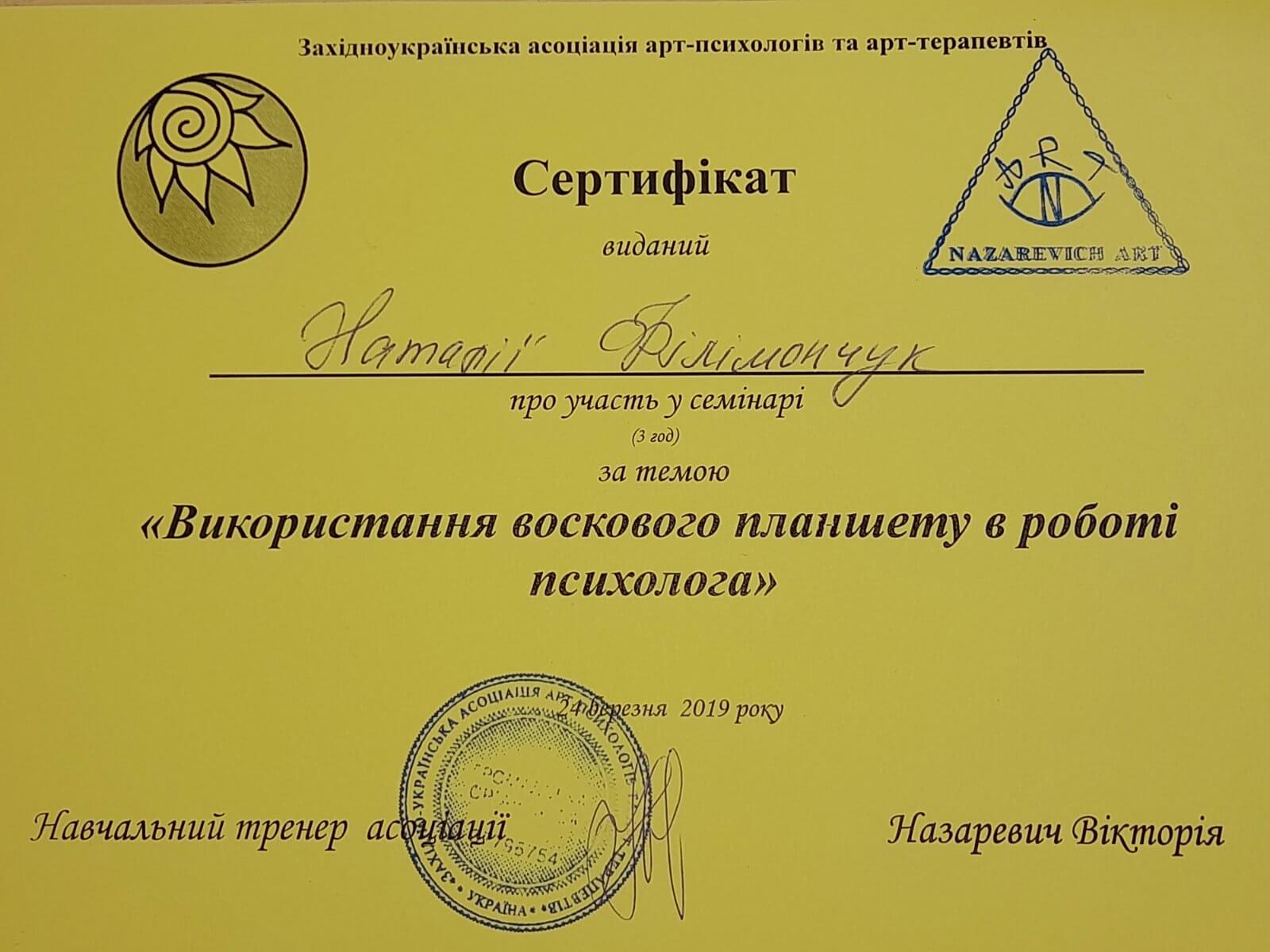 22.03.2020 — Курс підготовки інструкторів з використанням авторського інструменту «Восковий планшет у роботі фахівців, які допомагаючих професій» 24 години.