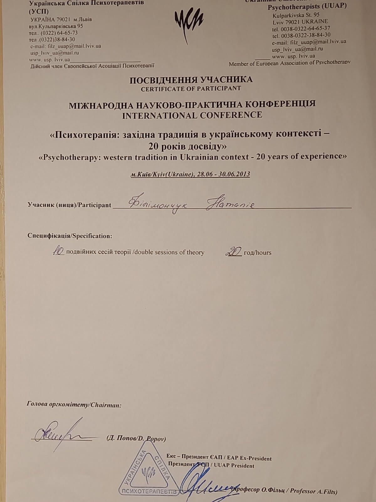 2013-2014 — учасник європейського освітнього проекту з психотерапевтичного консультування при Вісбаденській академії психотерапії (WIAP, м.Вісбаден, Німеччина). Сертифікат консультанта у методі позитивної психотерапії (№057UKR-2014) від Всесвітньої асоціації позитивної психотерапії (WAPP, м.Вісбаден, Німеччина).