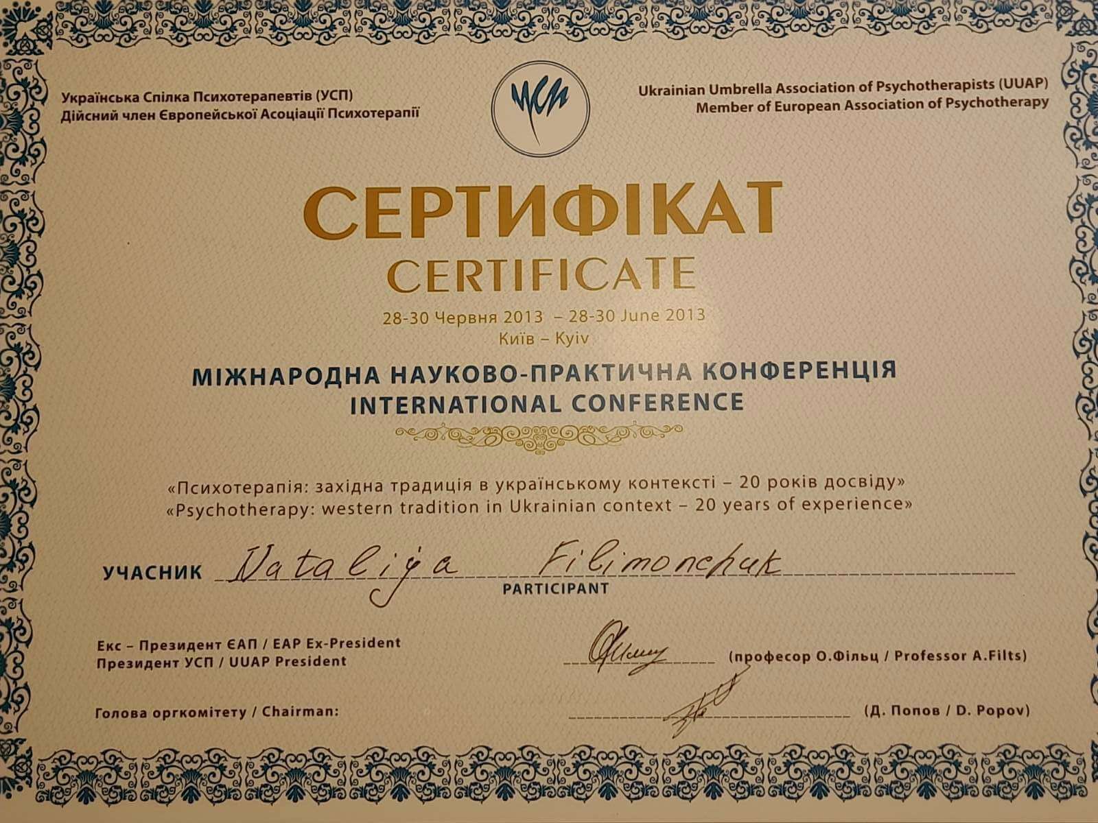 Червень 2013 – учасник міжнародної конференції УСП «Психотерапія: західна традиція в українському контексті – 20 років досвіду», де вдалося безпосередньо перейняти досвід у десятків провідних психотерапевтів та супервізорів з України, Литви, Польщі, Австрії, Німеччини, Швеції, Франції, Великобританії, США , Канади та інших країн світу.
