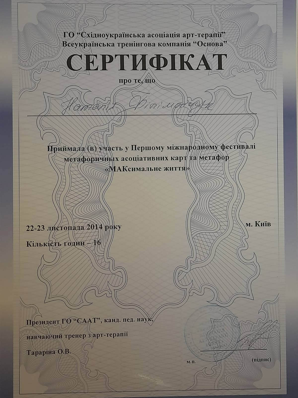 22-23 листопада 2014 року – учасник Першого міжнародного фестивалю метафор, метафоричних карт та психологічних практик «МАКсимальне життя». Сертифікат участі.