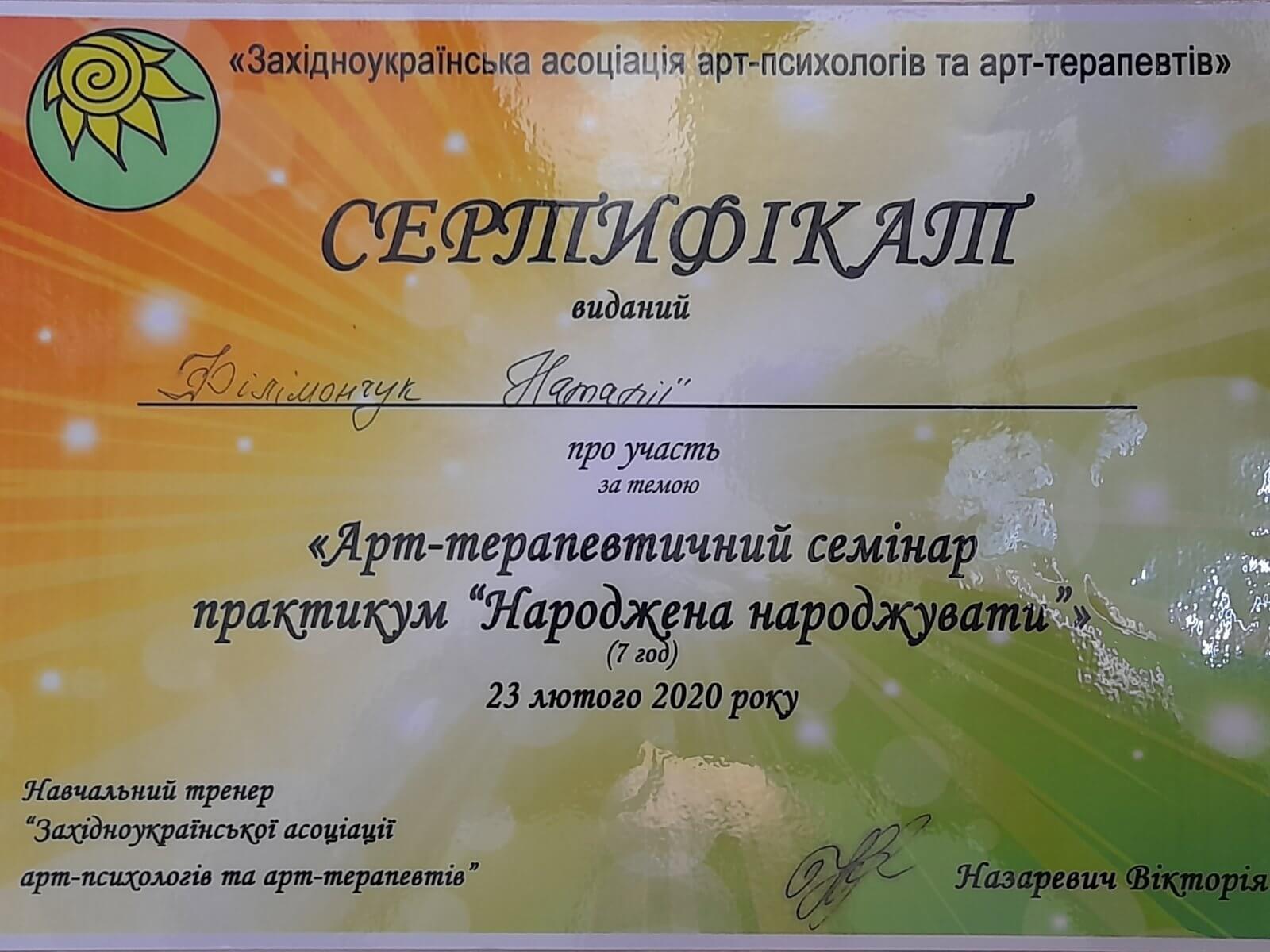 17.10.20 – 20.11.21 року – Візуальні практики арттерапії в роботі з дітьми. Свідоцтво підвищення професійних компетенцій. Центр надання освічених послуг ТМ «Nazarevich Art».