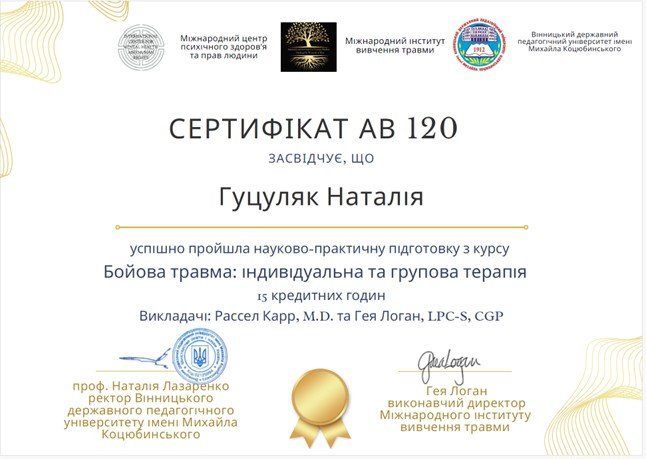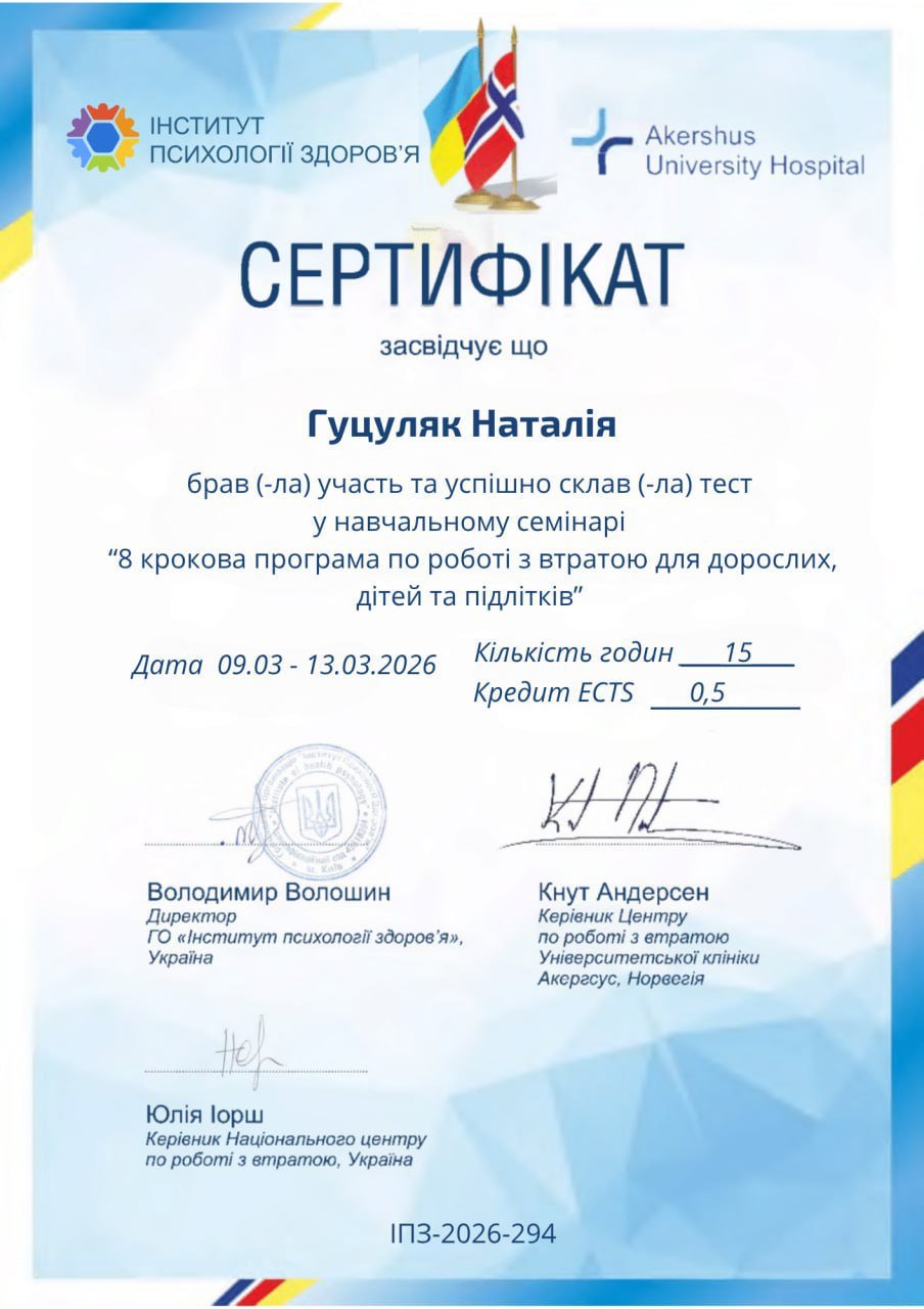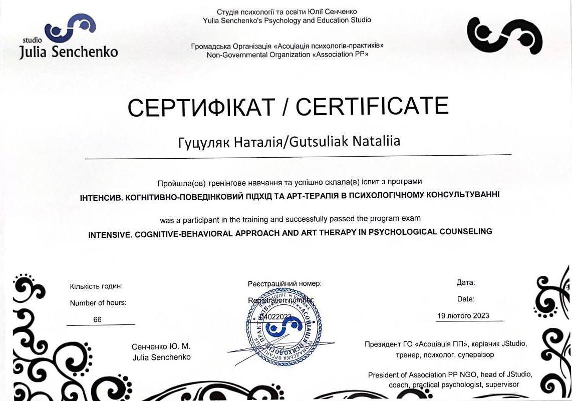Вітаю! Мене звати Наталія Гуцуляк – психолог, консультант в напрямі КПТ. Проводжу індивідуальні та групові консультації. Мій багаторічний досвід роботи та постійний розвиток допомагає підібрати відповідні методи, техніки, практики індивідуально під ваш запит. Базова освіта – практична психологія. Додатково використовую арт – терапію, МАК. Учасник супервізійних груп для психологів та психотерапевтів. Поєдную викладацьку діяльність з приватною практикою.
