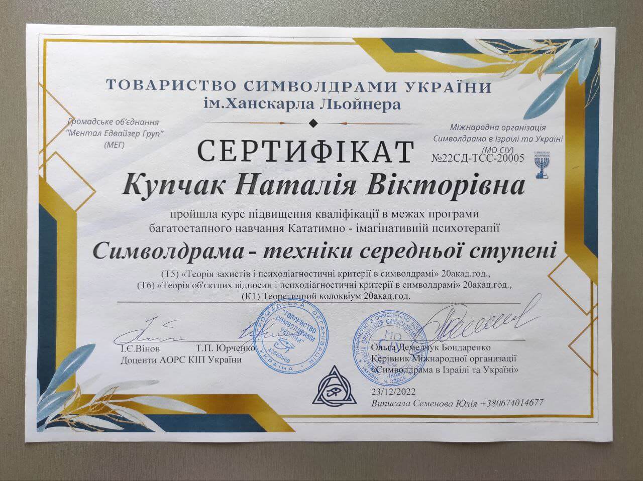 Отримую в Україні психотерапевтичну освіту по Символдрамі (кататимно-імагінативній психотерапії) з 2020 р.
