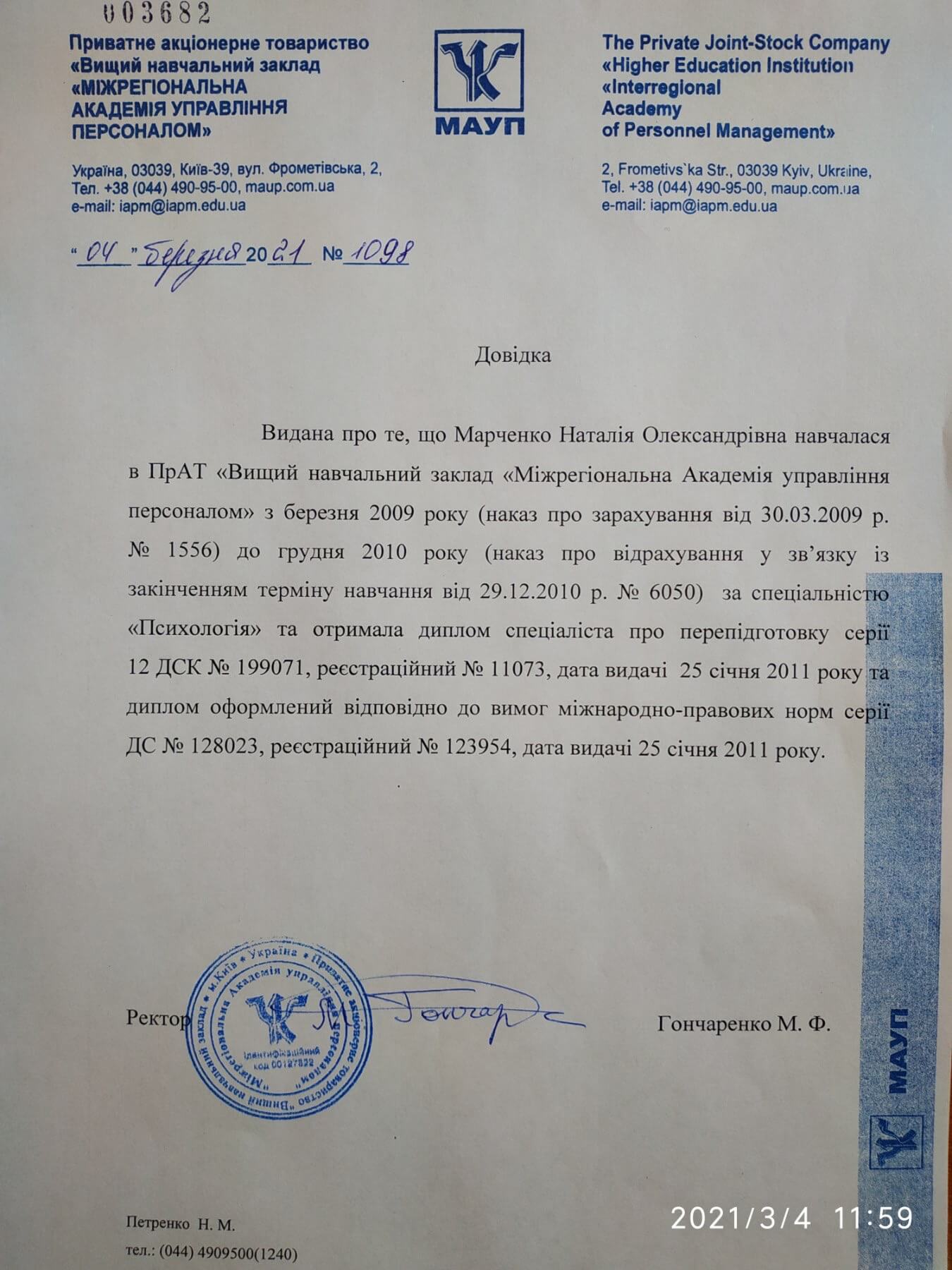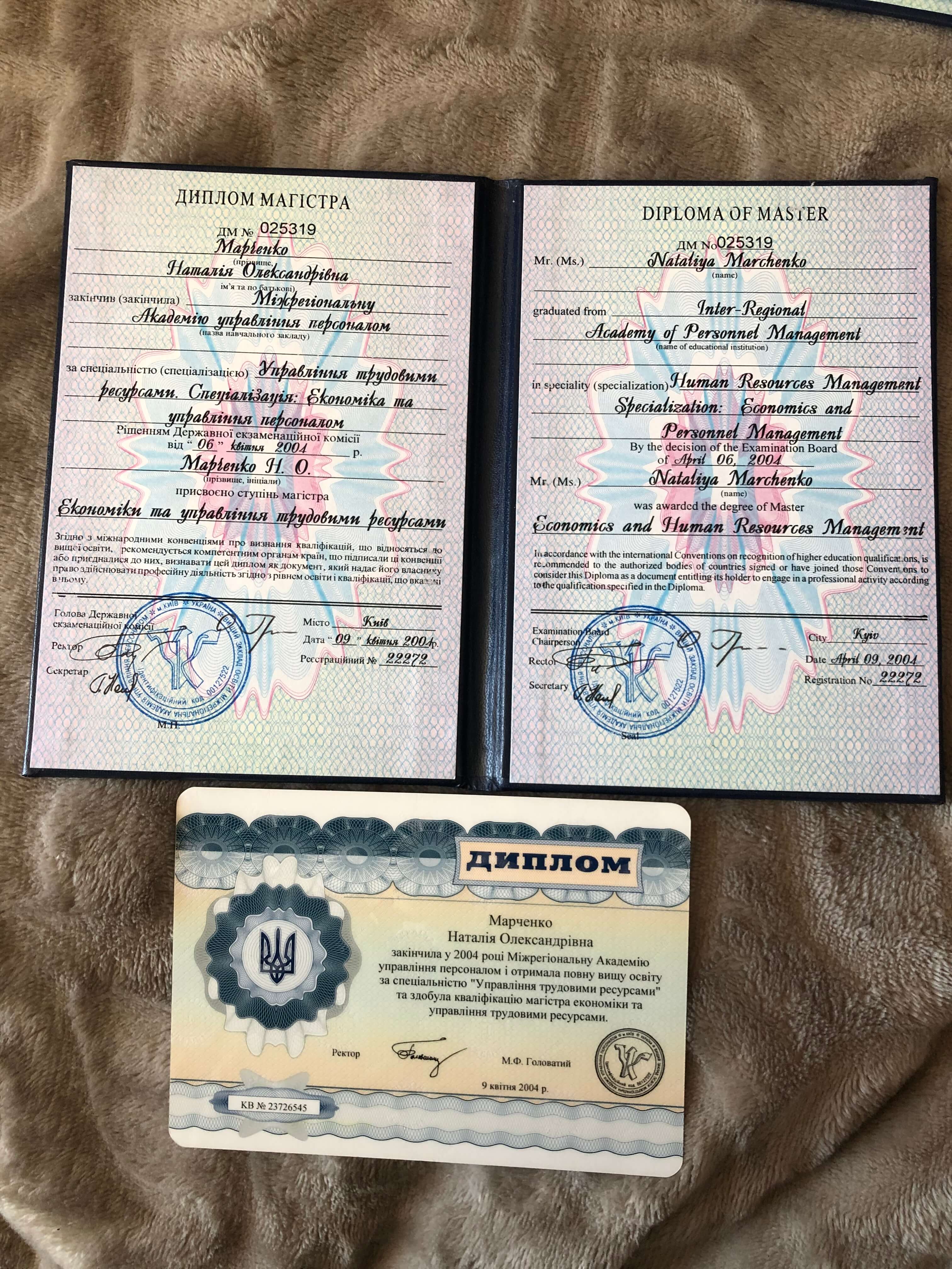 2008 – 2010 – Міжрегіональна Академія Управління Персоналом. Спеціальність: Психологія. Спеціалізація – Практичний психолог.