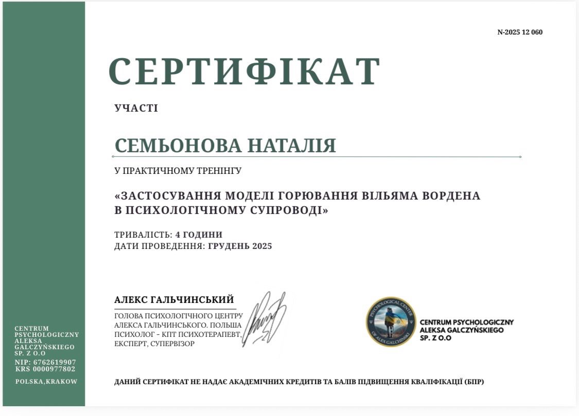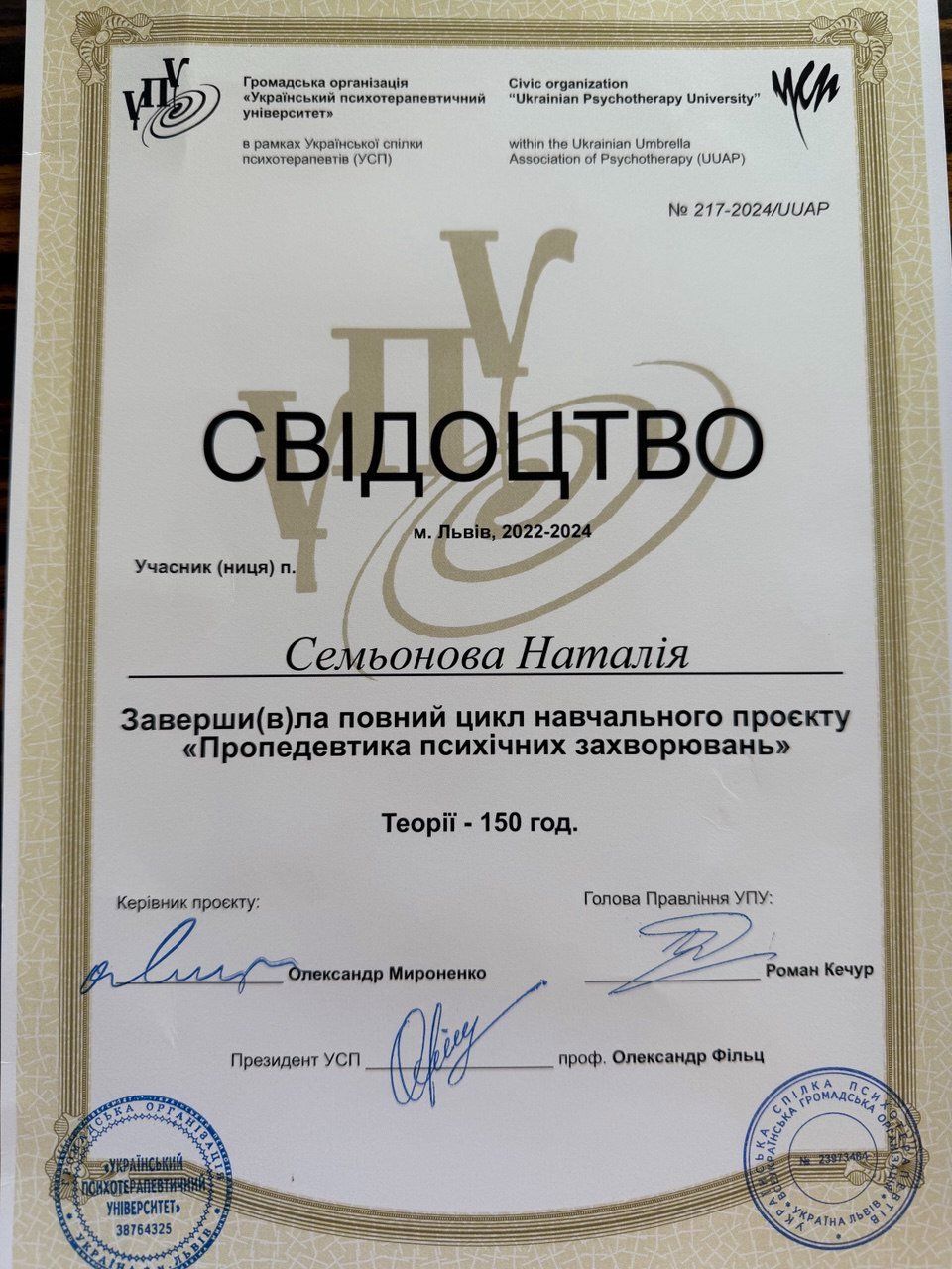 На першій зустрічі ми знайомимося, обговорюємо ваш запит, те, що вас турбує зараз, і визначаємо напрямок роботи. Для мене важливо зрозуміти вашу історію, життєві обставини та те, яких змін ви хочете досягти.