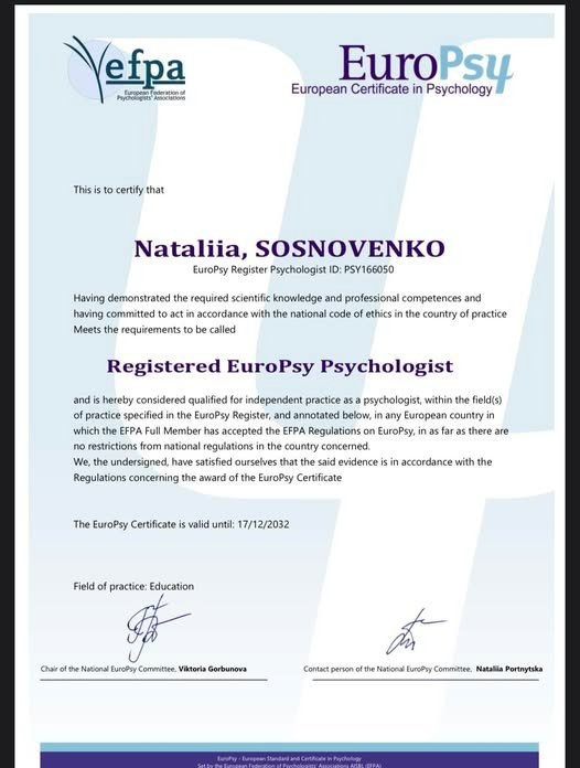 Як фахівець, я дотримуюсь юридичних аспектів та етичних стандартів роботи психолога/психотерапевта. Під час роботи я намагаюся створити комфортний простір. Як фахівця мене включено до Європейського реєстру психологів EuroPsy (дипломи визнані у 32 країнах) та реєстру психологів НПА