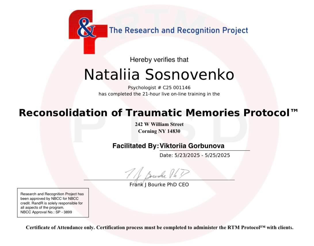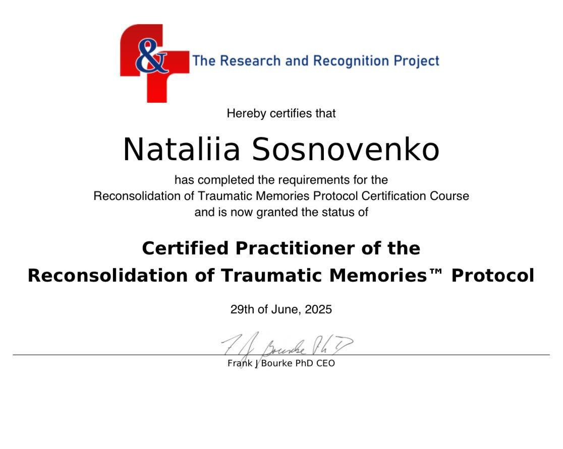 Психотерапія сформувала мою професійну позицію: працювати обережно, етично, з повагою до темпу людини та її досвіду, особливо коли йдеться про травму. Саме тому я постійно продовжую навчання, проходжу супервізії та власну терапію — не як формальність, а як необхідну умову відповідальної психологічної практики.
