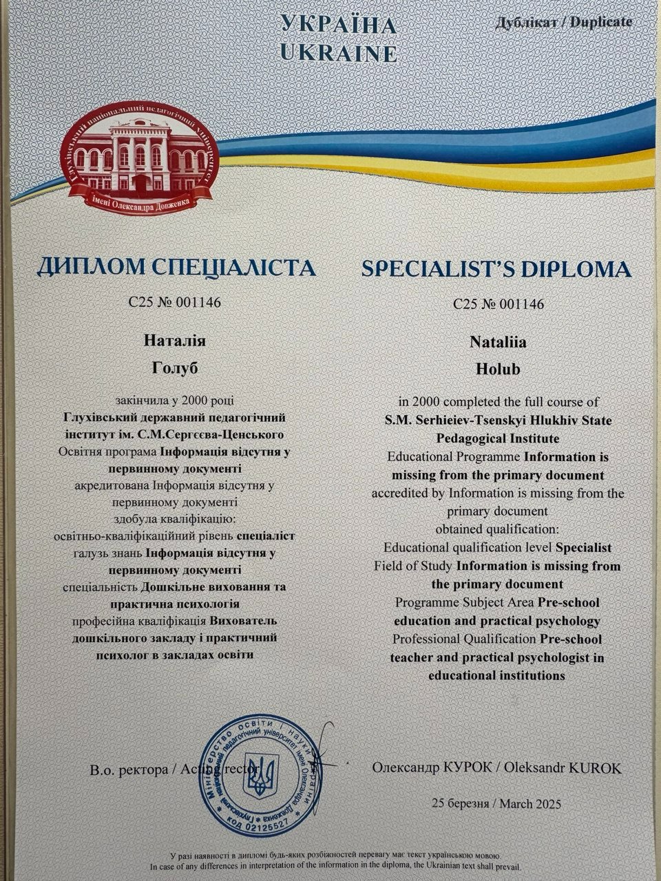 Підвищення кваліфікації: робота з горем, мирне вирішення конфліктних ситуацій, травмотерапія. На даний момент закінчую навчання на другому ступені гештальттерапії,